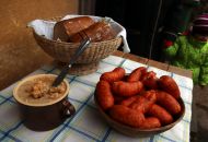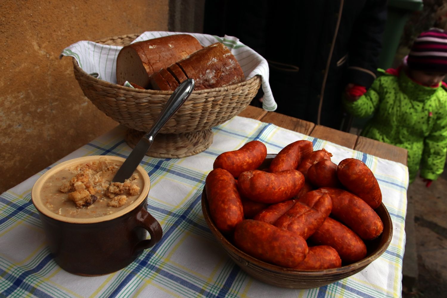 Na chuť se podával třeba chleba se třemi druhy domácího sádla, škvarkové pagáče, bramborový závin se škvarky a slaninou, špekáček k opečení, klobásy, horké nápoje, prostě samé dobroty.