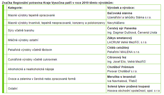 Značku Regionální potravina získalo na Vysočině dalších osm výrobků.