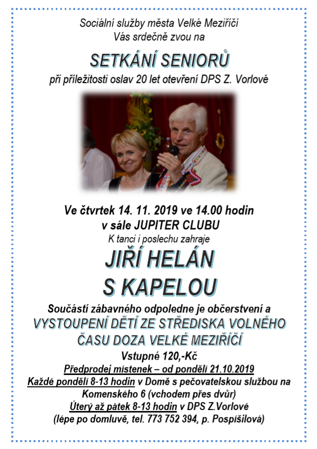 Sociální služby města Velké Meziříčí Vás srdečně zvou na SETKÁNÍ SENIORŮ při příležitosti oslav 20 let otevření Domu s pečovatelskou službou na ulici Z. Vorlové.