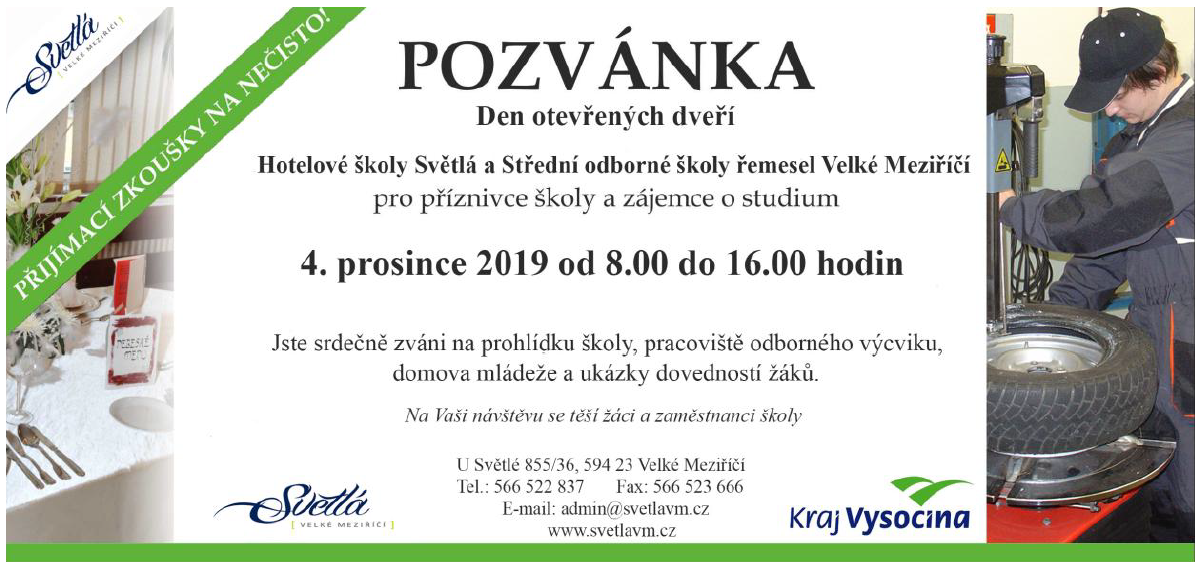 Velkomeziříčská Hotelová škola Světlá a SOŠ řemesel chystá pro veřejnost, a především pro zájemce o studium, den otevřených dveří. Ten letošní se uskuteční 4. prosince a již tradičně bude spojen s adventní a vánoční tematikou.