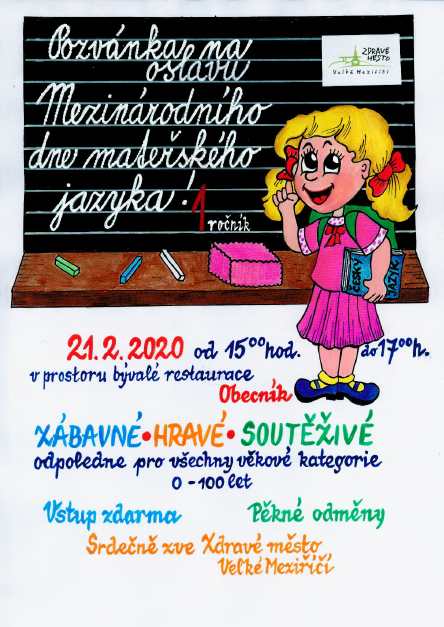 Zdravé město Velké Meziříčí vás srdečně zve na 1. ročník oslavy Mezinárodního dne jazyka, která proběhne v pátek 21. února v prostorách bývalé restaurace Obecník.