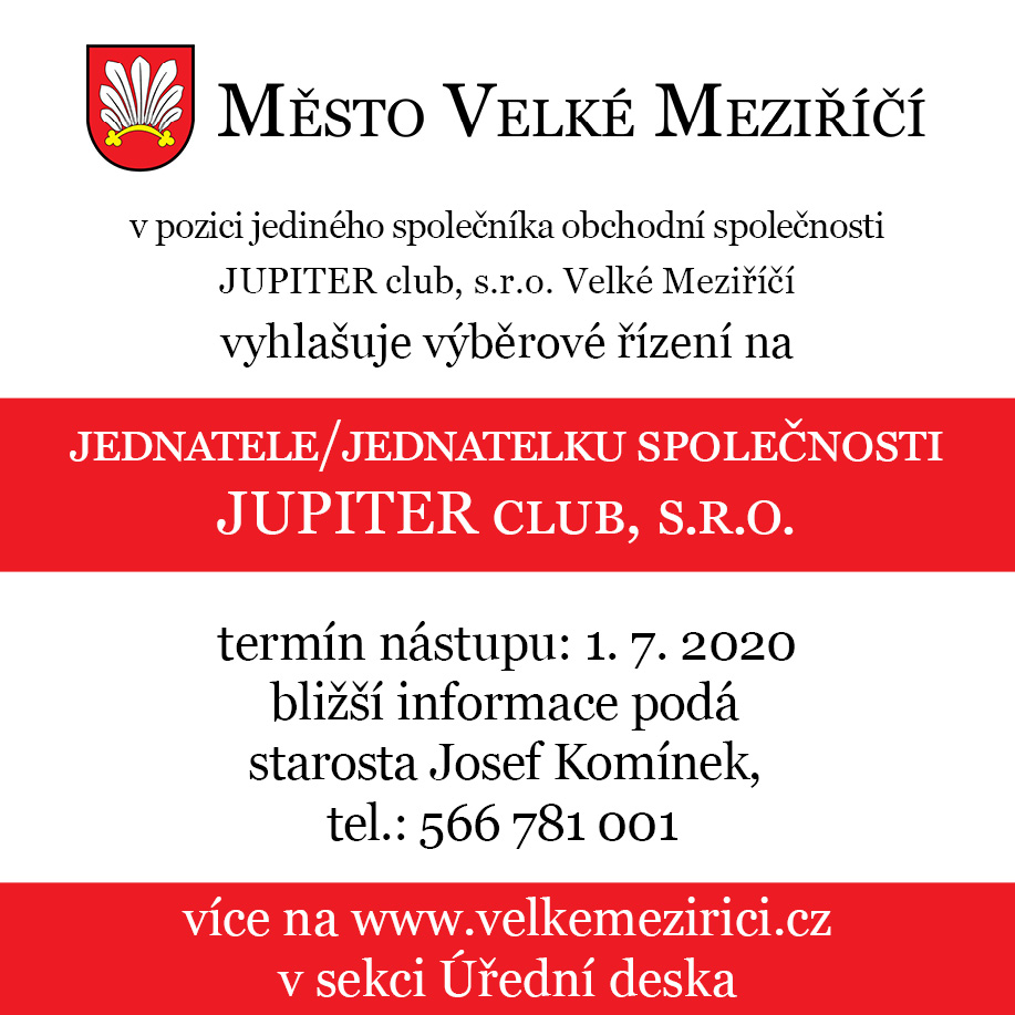 Město Velké Meziříčí v pozici jediného společníka obchodní společnosti JUPITER club, s.r.o. vyhlašuje výběrové řízení na obsazení funkce jednatele/jednatelky.