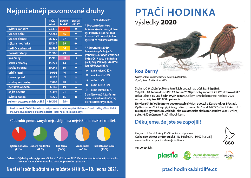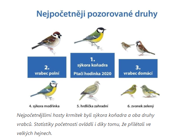 Druhý lednový víkend byl v Česku ve znamení sčítání ptáků na krmítkách, do kterého se dobrovolně zapojilo přes 21 tisíc lidí, což je o 7 tisíc víc než loni. Díky spolupráci veřejnosti získala Česká společnost ornitologická (ČSO) údaje o tom, kteří ptáci kde navštěvují krmítka. Pomocí dlouhodobého projektu občanské vědy ČSO časem zjistí, kteří ptáci u nás v zimě ubývají či přibývají. Další ročník sčítání ptáků na krmítkách plánuje ČSO na 8.–10. ledna 2021.