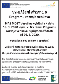 MAS MOST Vysočiny vyhlásila k datu 19. 3. 2020 výzvu č. 6 v rámci Programu rozvoje venkova, s příjmem žádostí od 26. 3. 2020.