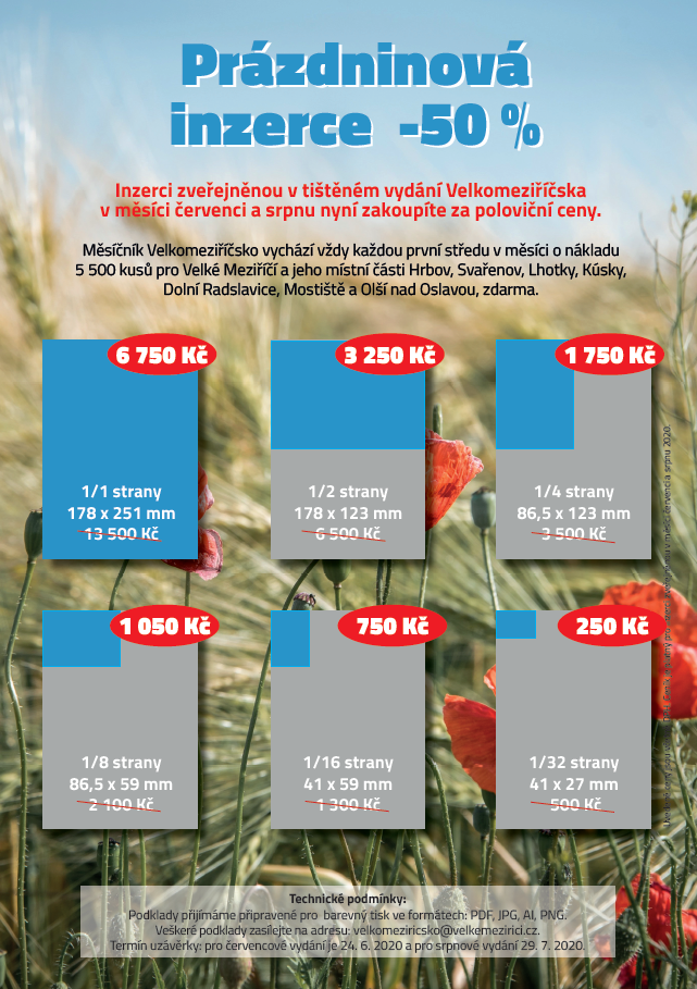 Měsíčník Velkomeziříčsko vychází vždy každou první středu v měsíci o nákladu 5 500 kusů pro Velké Meziříčí a jeho místní části (Hrbov, Svařenov, Lhotky, Kúsky, Dolní Radslavice, Mostiště a Olší nad Oslavou). Distribuován je do každé poštovní schránky zdarma. Ze šesti nabízených rozměrů je nejlevnější malý rozměr za 250 korun a nejdražší celá strana inzerce za 6 750 korun. Podklady přijímáme připravené pro barevný tisk ve formátech: PDF, JPG, AI, PNG. Inzeráty a případné dotazy zasílejte na e-mailovou adresu: Tato e-mailová adresa je chráněna před spamboty. Pro její zobrazení musíte mít povolen Javascript. .
