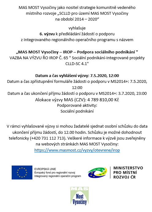 MAS MOST Vysočiny jako nositel strategie komunitně vedeného místního rozvoje „SCLLD pro území MAS MOST Vysočiny na období 2014 – 2020" vyhlašuje 6. výzvu k předkládání žádostí o podporu z Integrovaného regionálního operačního programu s názvem: