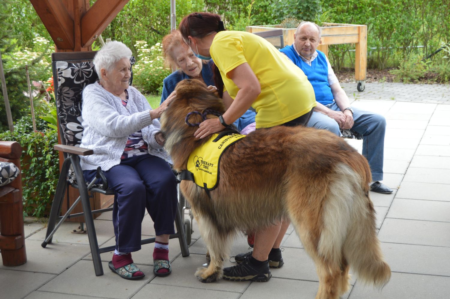 Vztah člověka a zvířete se v našem domově podporuje plnými doušky. Návštěvníci mohou slyšet andulky na Pomněnce, nebo vidět morčata v přízemí. V rámci zahradnického kroužku se občas potkáváme i s koťátky, ale canisterapie je nedílnou součástí našeho domova od nepaměti. Domovní psí tým se skládá ze šesti chlupáčů od jorkšírského teriéra po leonbergera s doprovody celkem čtyř terapeutů, kteří jsou odbornými dozory při průběhu léčby. Díky rozmanitosti psích charakterů navštěvujících naše seniory využíváme canisterapii stále častěji. Každý psí návštěvník má jiné dovednosti a povahu, která z něj dělá další jedinečné stvoření, podobně jako u lidí, proto jsme rádi za početnější smečku.