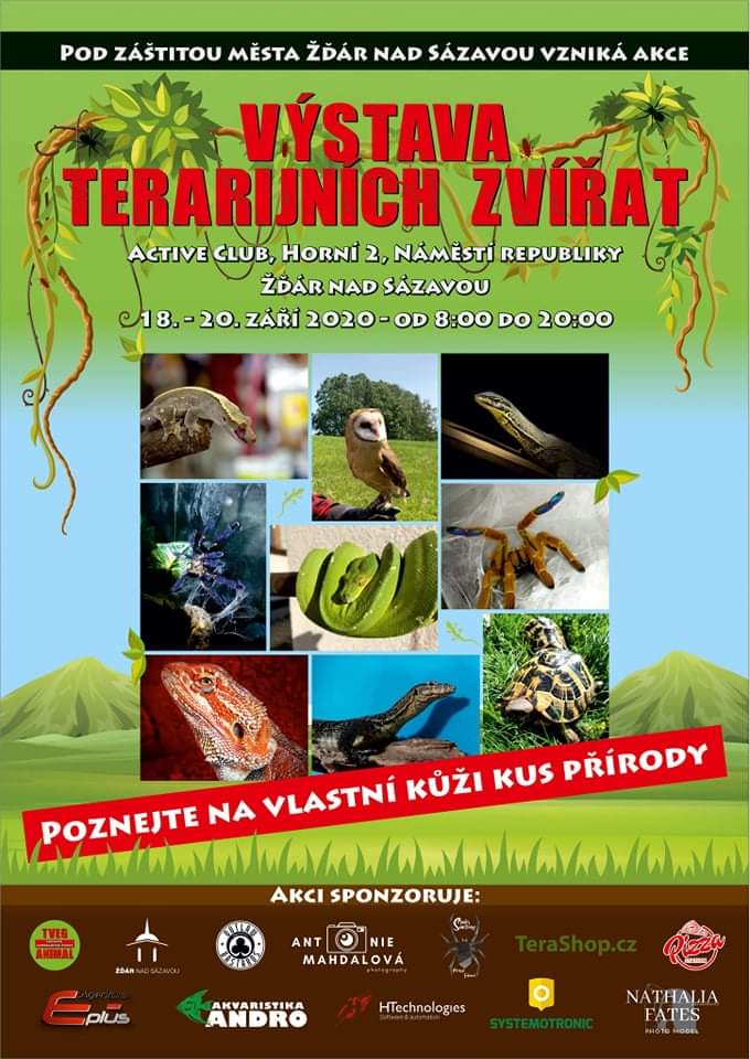 Tamní Active club ožije výstavou hadů, agam, varanů, gekončíků, gekonů, pagekonů, anolisů, chameleonů, želv, papoušků, pavouků, švábů syčivých a jiných zástupců bezobratlých. Výstavu obohatí i nádherná sova pálená a návštěvníci budou moci shlédnout nejen všechny tyto živé exponáty, ale také pohovořit s chovateli, dozvědět se spoustu zajímavých informací o chovu, a třeba i to, kde se dá vystudovat obor chovatel exotických zvířat a jaké je následné uplatnění studentů. Výstavu, kterou zaštiťuje Město Žďár nad Sázavou, organizuje mladý profesionální chovatel Tomáš Vodička z Hlinska. To, že je k tomuto koníčku, který se mu postupem času stal profesí, zapotřebí mnoho píle a stovky hodin studia odborné literatury či návštěv burz, netřeba nic dodávat. Velké Meziříčí zastupuje skoro třináctiletý chovatel sklípkanů Tomáš Jindřich Cejnek, žák 7. třídy ZŠ Sokolovská, který svému chovatelskému nadšení plně propadl zhruba před rokem. Na výstavě představí celkem 21 pavouků rodu brachypelma, kochiana, chromatopelma, poecilotheria a mnohé další. Vystavovatelé děkují Městu Žďár nad Sázavou a četným sponzorům, bez kterých by se celá akce nemohla konat.