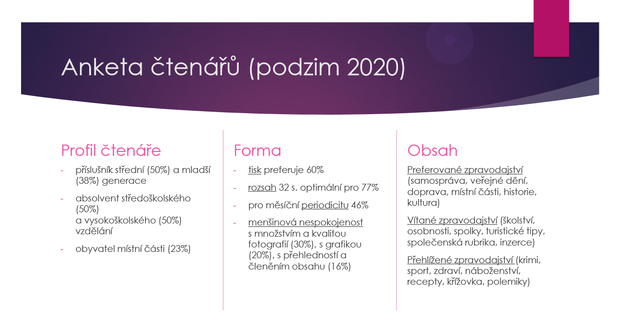 Zpravodaj by se měl ustálit také po stránce grafické i formální. „Redakci navrhujeme například ustálení umístění rubrik, sjednocení barevnosti a fontu textu, vyváženou kombinaci obrazu a textu, nebo jasné oddělení komerčních sdělení. Potvrdilo se nám také to, že lidé očekávají jiný obsah v tištěné a webové verzi zpravodaje. Web by měl pružně reagovat na aktuální témata, zatímco tištěný zpravodaj by měl jít obsahově více do hloubky," doplnila vize redakční rady Dagmar Handová. S ohledem na obměnu redakčního týmu se budou úpravy zpravodaje objevovat v průběhu roku 2021.