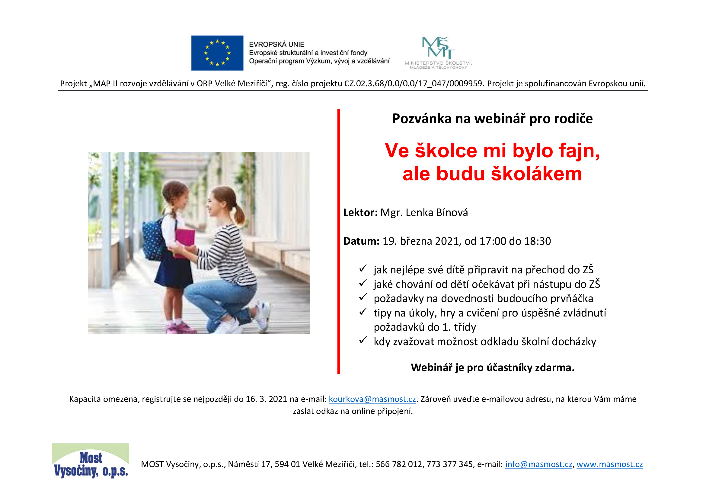 nejpozději do 12. března. V pátek 19. března se bude lektorka Lenka Bínová zabývat přechodem dítěte z mateřské do základní školy, registraci provedete stejně jako u prvního webináře nejpozději do 16. března. Kapacita obou je omezená.