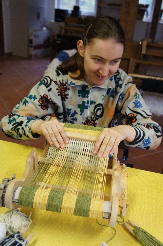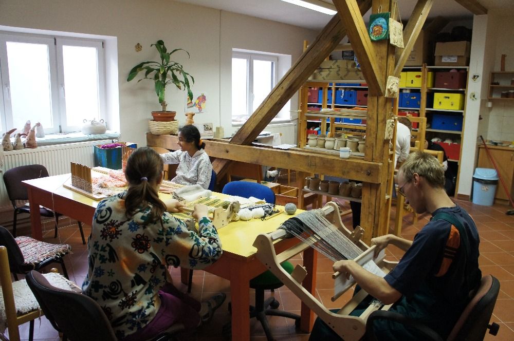 Tkalcovská dílna: tkaní na kolíkových stávcích i na vícelistových stavech, výroba koberečků, podsedáků, polštářů, tašek