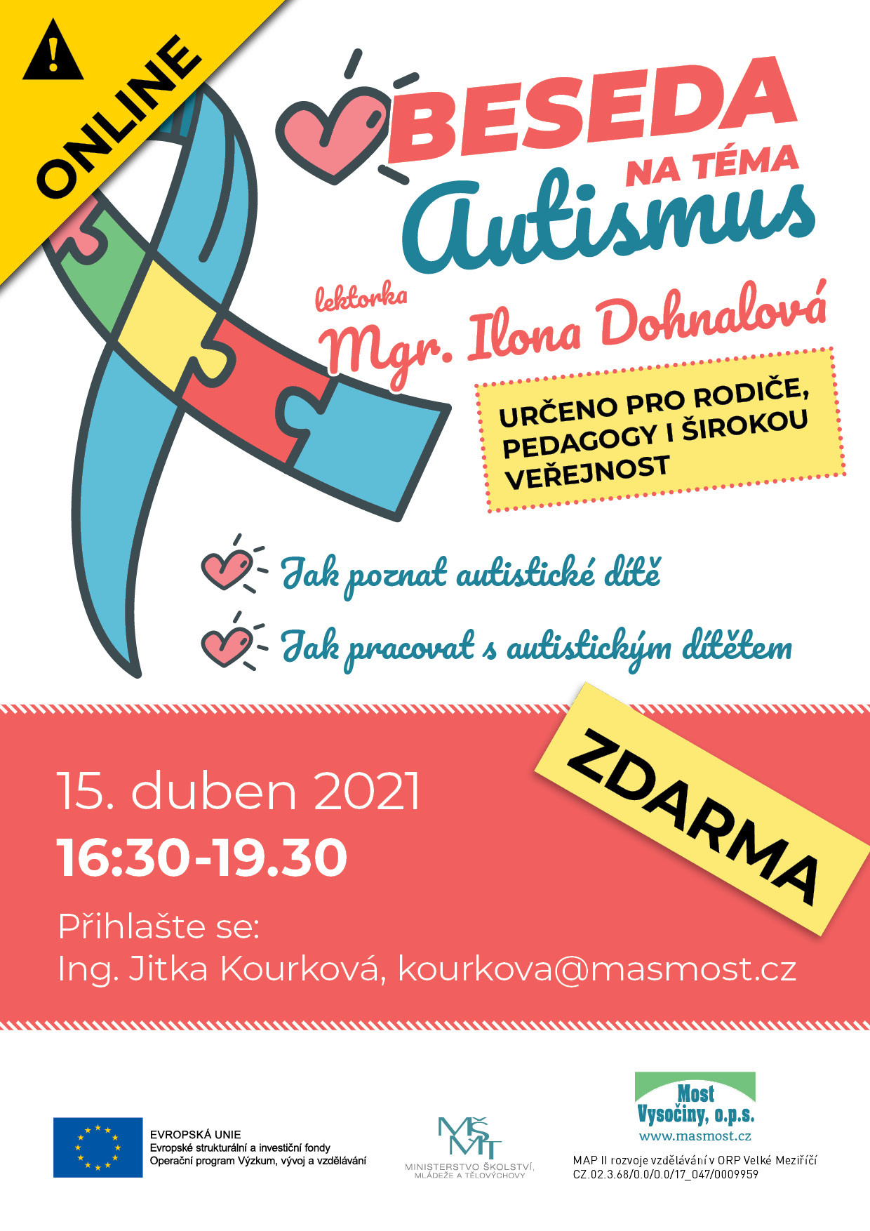 Obecně prospěšná společnost Most Vysočiny zorganizovala na polovinu dubna webinář zdarma. Stěžejním tématem online besedy je autismus. Lektorka Ilona Dohnalová zodpoví základní otázky, jak poznat autistické dítě a jak s ním následně pracovat. Webinář se odehraje 15. dubna a přihlásit se paní Jitce Kourkové (