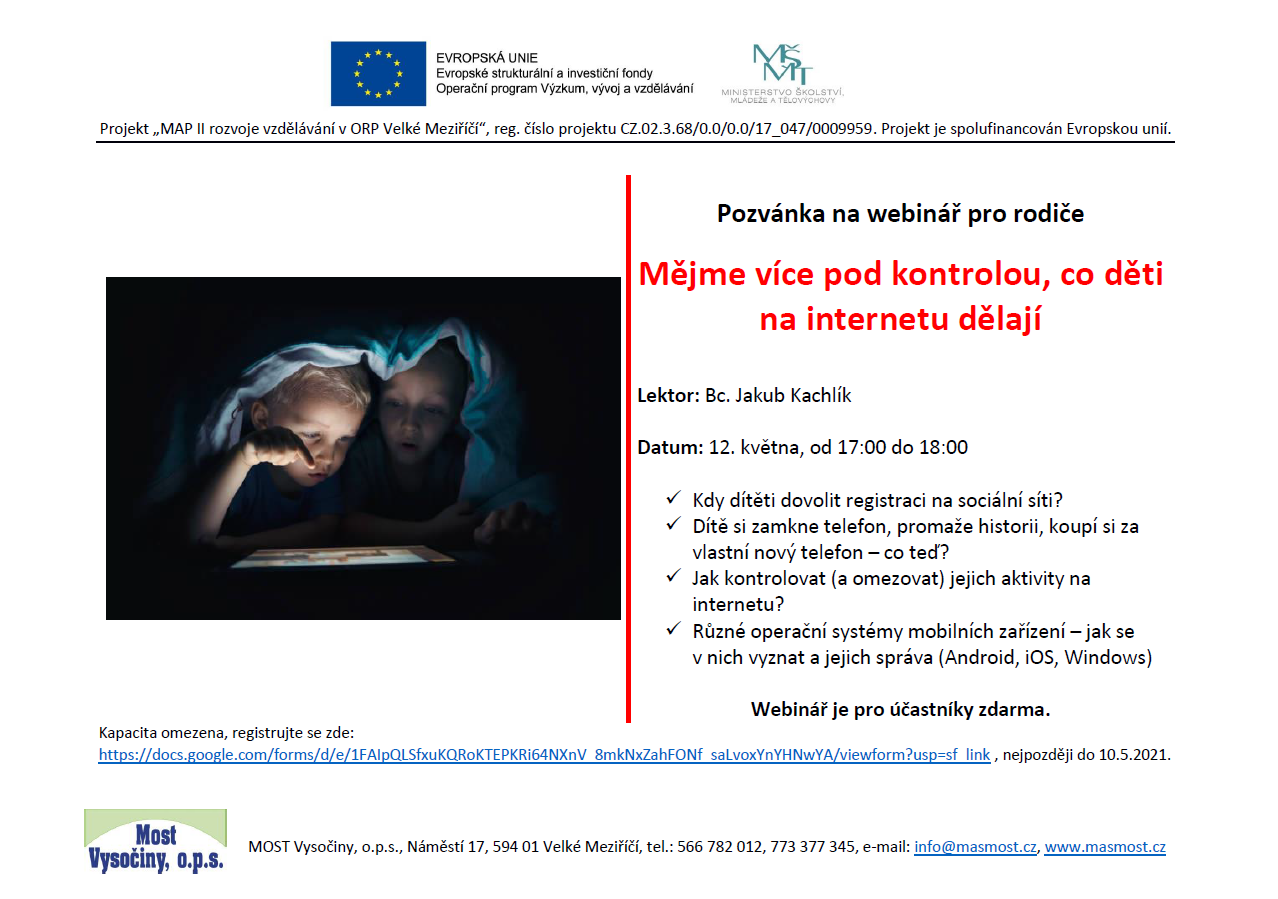Doba covidová a distanční výuka „připoutala" děti k počítačům. Máte přehled o tom, co sledují na internetu? Víte, jak kontrolovat a omezovat jejich aktivity? Odkdy je dobré dovolit dítěti registraci na sociální síť? Pokud si kladete tyto a podobné otázky, nenechte si ujít praktický webinář pro rodiče. Ve středu 12. května od 17:00 do 18:00 hodin, kapacita je omezená. Registrace je možná nejpozději do 10. května 2021 na webové stránce. Webinář je zdarma a provede jím lektor Bc. Jakub Kachlík. Pořádá MOST Vysočiny, o.p.s.