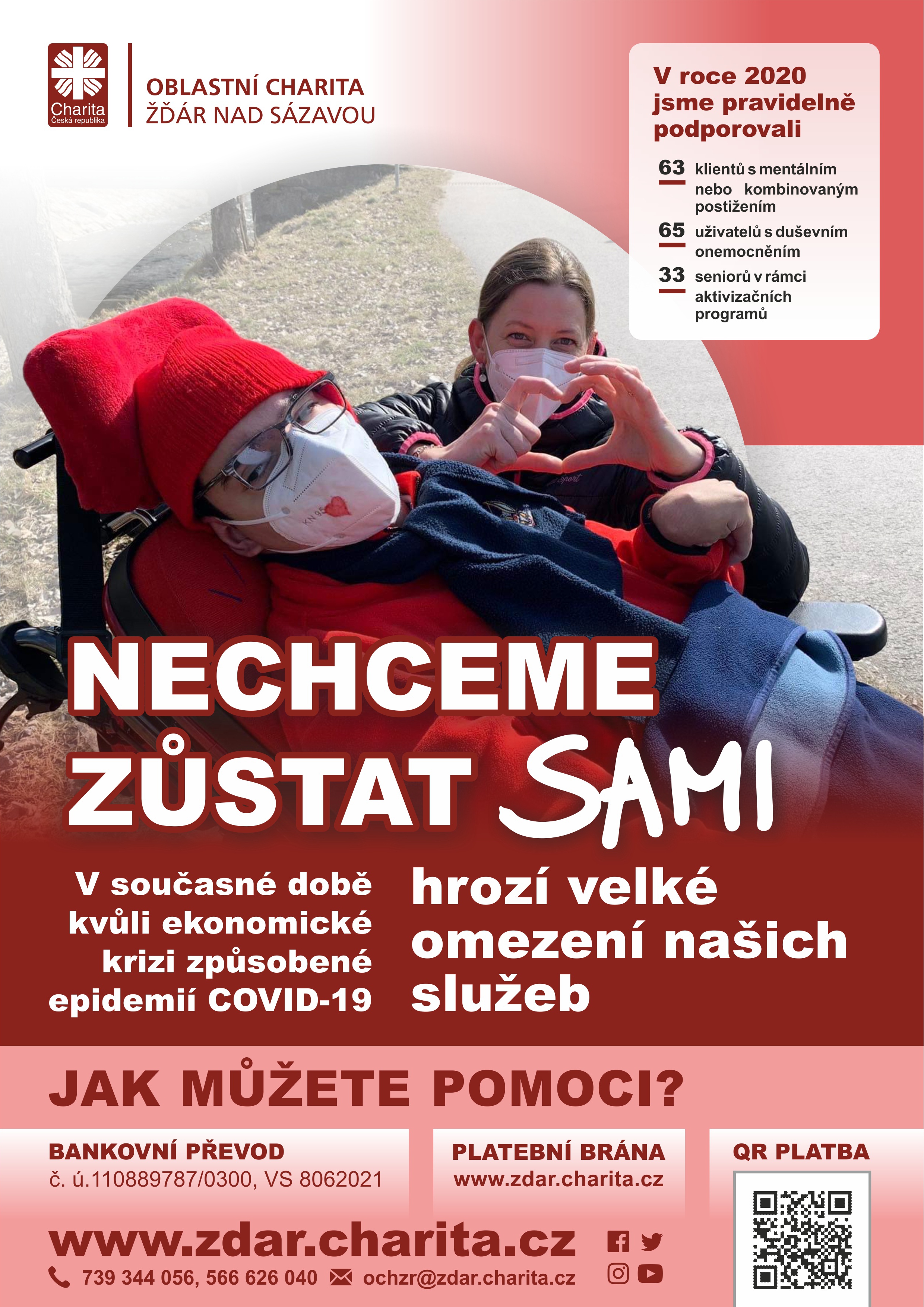 Kampaň s názvem „Nechceme zůstat sami" vyhlásila pro období května a června Oblastní charita Žďár nad Sázavou na podporu služeb, které poskytují péči lidem s duševním onemocněním, mentálním či kombinovaným postižením a seniorům, hledajícím náplň svého volného času. Jejím cílem je seznámit veřejnost s potřebnými službami, které se aktuálně ocitají v ohrožení z důvodu ekonomické krize způsobené pandemií COVID-19.