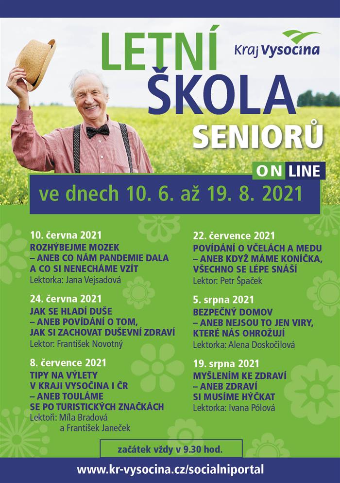 Úspěšný přednáškový cyklus pro seniory s názvem Letní škola seniorů se vrací. V loňském roce se měl uskutečnit již sedmý ročník těchto přednášek, ale covidová doba této aktivitě nepřála. Uplynulý rok nám některé věci vzal, ale mnohému jsme se přesto naučili. Třeba organizovat svůj čas, obsluhovat techniku a pohybovat se na sociálních sítích. To všechno se nám bude v letošním roce hodit, protože oblíbené přednášky (nejen) pro seniory se uskuteční v online prostředí a všichni zájemci budou mít příležitost si je pustit na sociálním portálu Kraje Vysočina.
