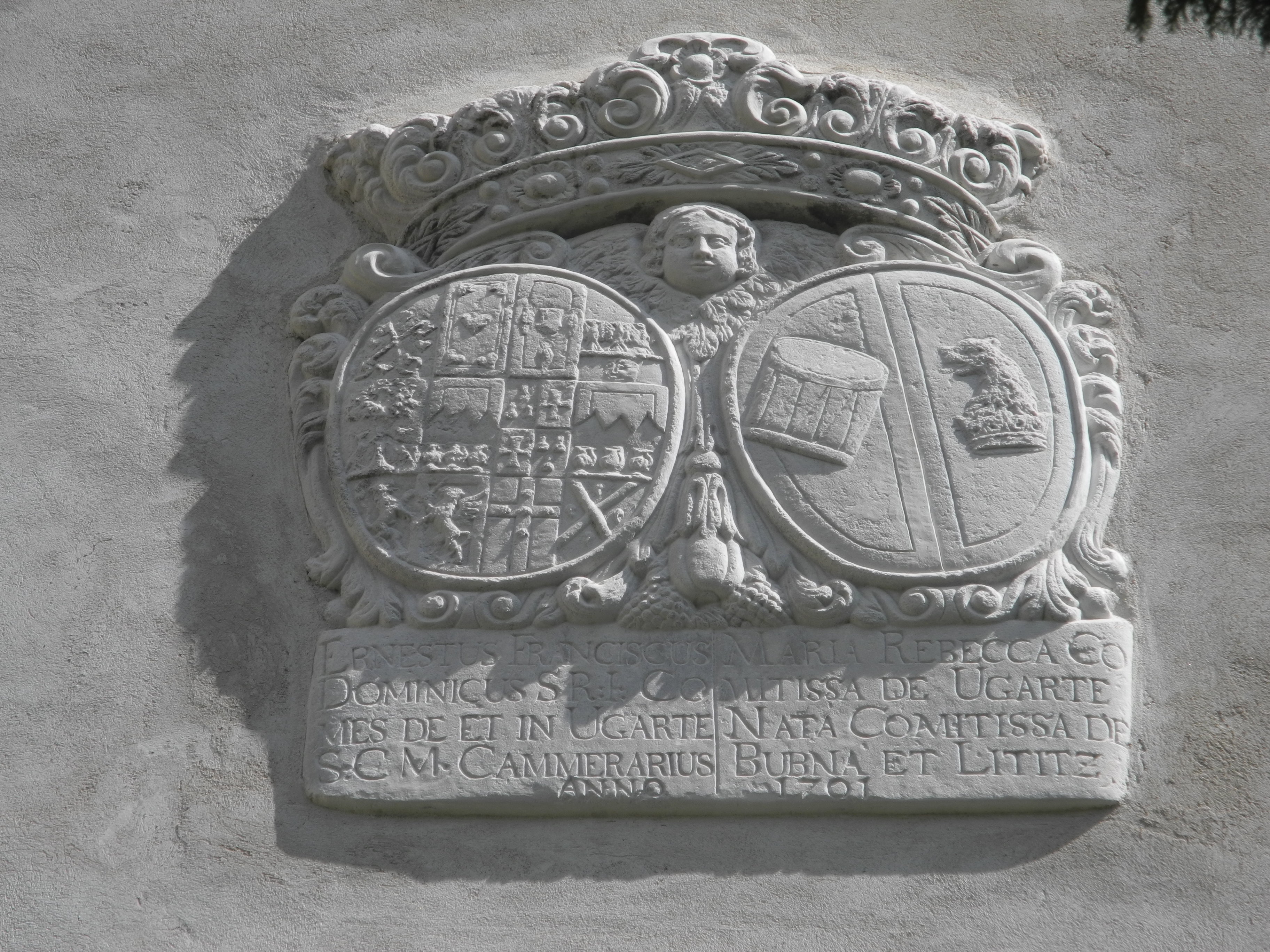 Petr hrabě Ugarte se věnoval vojenskému „řemeslu". Postupně stoupal na žebříčku hodností, takže nakonec dosáhl hodnosti generála a byl členem dvorské vojenské rady. Po jeho smrti (1681) se majitelem zámku stal jeho syn Arnošt František Dominik. Spojené erby Arnošta Františka a jeho druhé manželky Marie Rebeky z Bubna a Litic s letopočtem 1701 můžeme dodnes spatřit zazděné v boční stěně věžové brány směrem od rybníčka Ochranečku. Kde byly umístěny původně, to už nevíme.