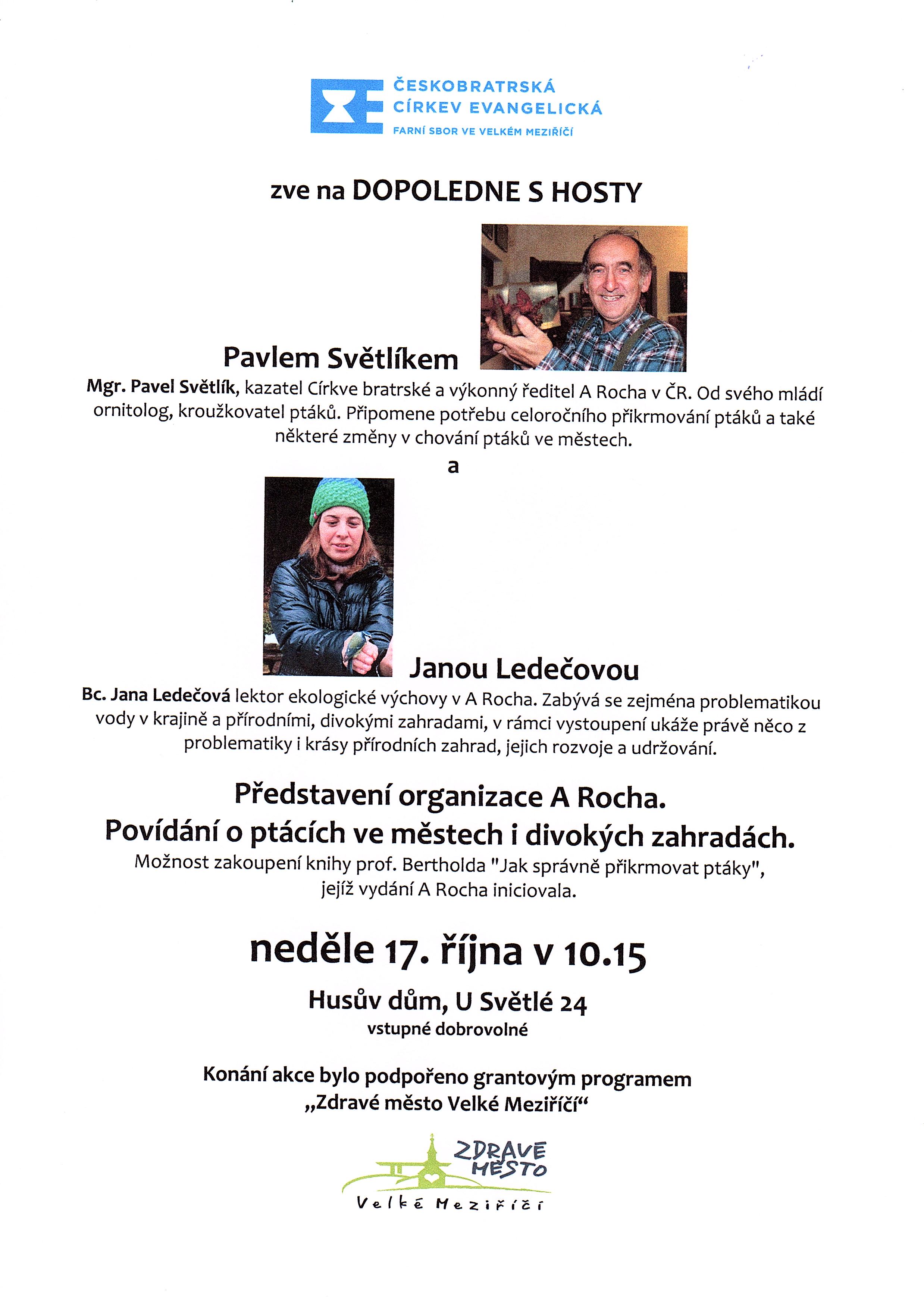 V neděli 17. října vystoupí v Husově domě od 10:15 hodin Pavel Světlík a Jana Ledečová. Představí se organizace A Rocha, součástí akce bude povídání o ptácích ve městech i divokých zahradách. Na místě bude možné zakoupit knihu prof. Bertholda "Jak správně přikrmovat ptáky", jejíž vydání A Rocha iniciovala.