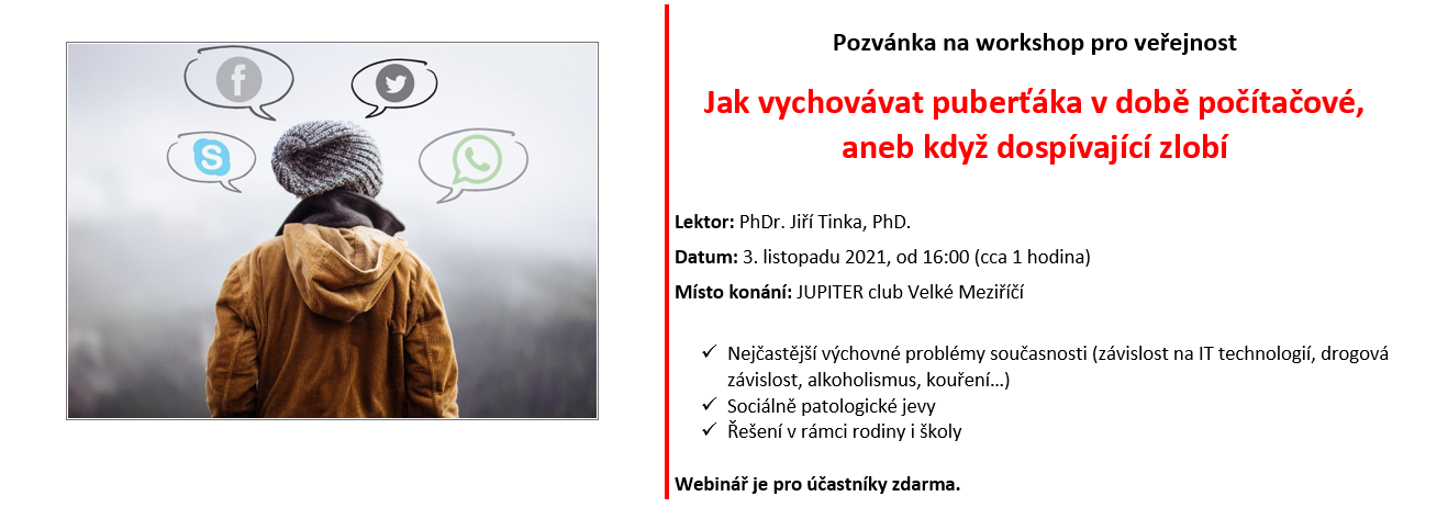 Lektorem workshopu je PhDr. Jiří Tinka, PhD., který se zabývá sociálně patologickými jevy, rodinnou problematikou a nejčastějšími problémy současnosti, které jsou spojeny s výchovou.