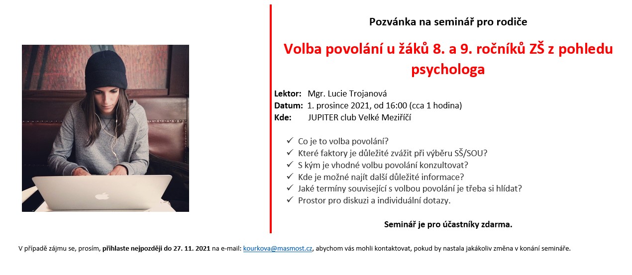 Seminář se koná 1. prosince od 16:00 hodin v Jupiter clubu, přibližná délka je 1 hodina. Tématem je volba povolání pro žáky 8. a 9. ročníků ZŠ z pohledu psychologa.