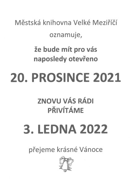 Vypůjčit si nebo vrátit knihy v městské knihovně ve Velkém Meziříčí bude letos možné naposledy 20. prosince. Znovu své dveře otevře až v pondělí 3. ledna 2022.
