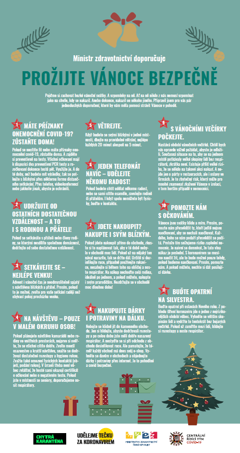 Ministerstvo zdravotnictví vydalo doporučení pro bezpečné prožití Vánoc. Nejvýznamnější opatření je zůstat v případě příznaků onemocnění doma a omezit setkávání na online formu (třeba přes telefon). Vždy, a to i venku, dodržujte bezpečnou vzdálenost. Nejlepší místo pro setkávání je právě venku. Pokud přijde návštěva za vámi domů, pravidelně větrejte. Zkuste nakupovat online. Pokud přece jen vyrazíte na nákup, nezdržujte se v obchodě zbytečně dlouho a nabídněte blízké rodině, že zároveň obstaráte nákupy i pro ně.