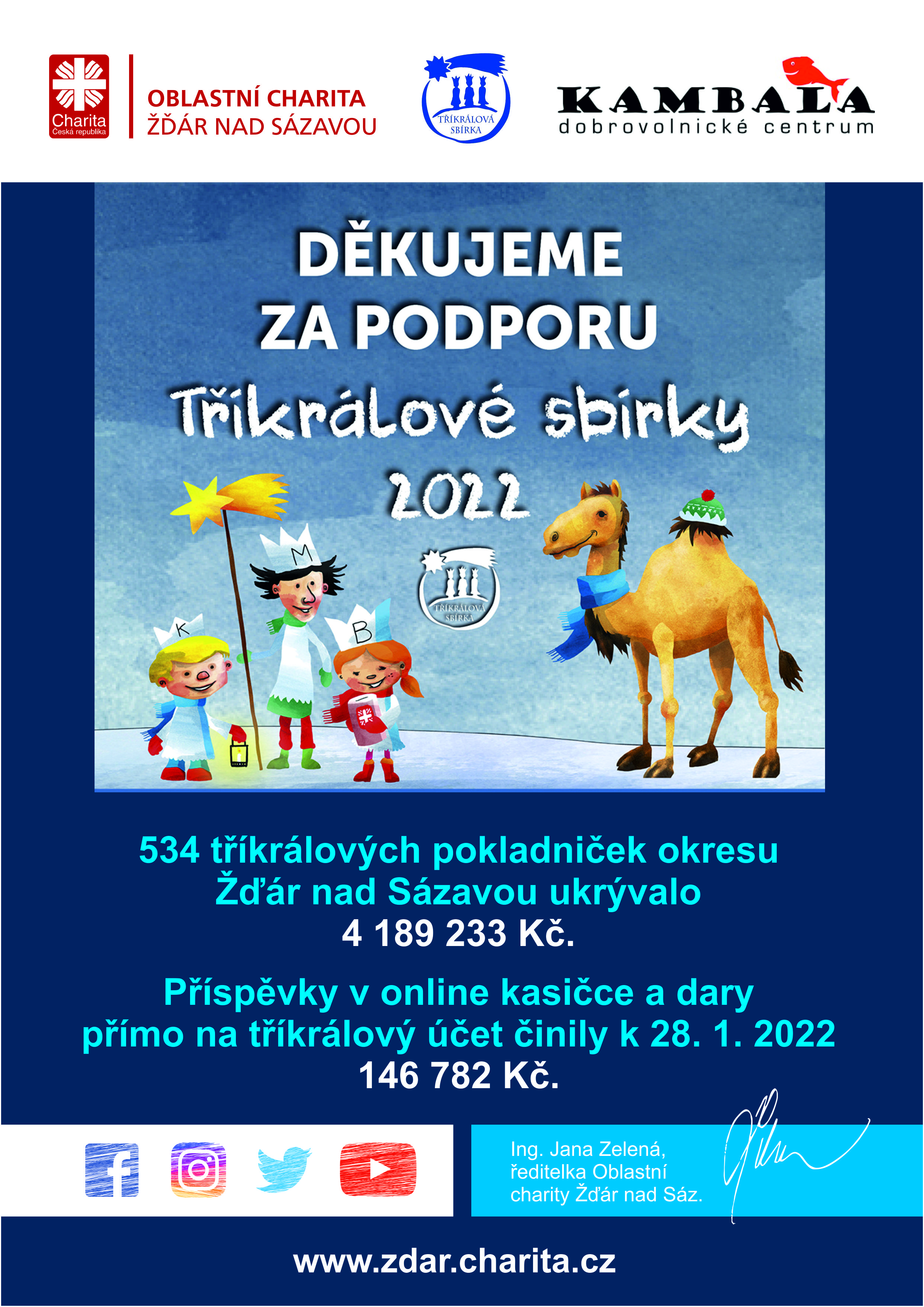 Tříkrálová sbírka roku 2022 opět překvapila. Součet všech 534 kasiček, které s třemi králi putovaly v prvních dvou týdnech po celém okrese Žďár nad Sázavou, činí pro letošní rok 4 189 233 Kč. To je o 407 122 Kč více než v roce 2020, kdy se Tříkrálová sbírka uskutečnila ještě v tradiční formě bez nastavených hygienických opatření.