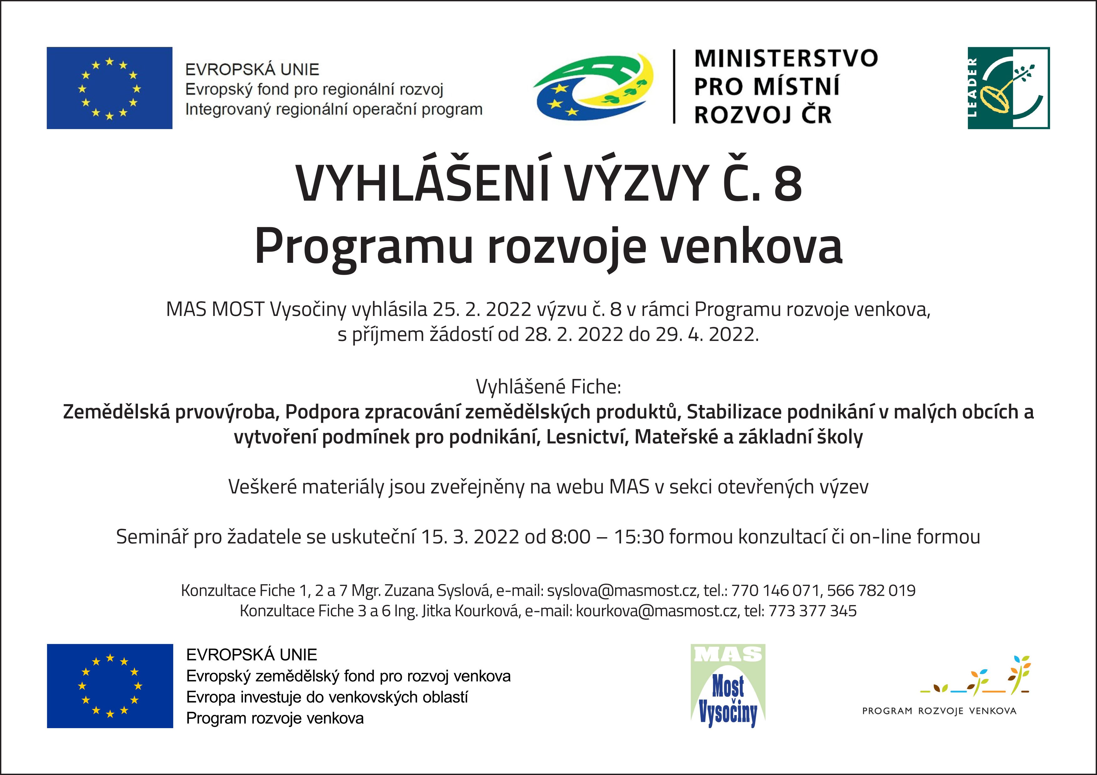 MAS Most Vysočiny vyhlásila výzvu číslo 8 z programu rozvoje venkova, žádosti je možné zasílat do pátku 29. dubna. K této příležitosti pořádá seminář, který se uskuteční v úterý 15. března od 8:00 do 15:30 formou konzultací či on-line formou.
