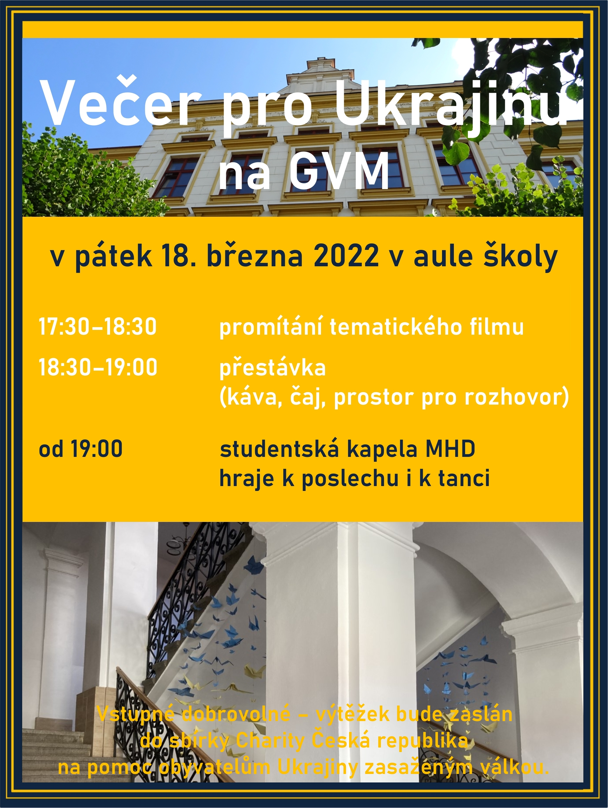 Studenti a učitelé Gymnázia Velké Meziříčí si vás dovolují pozvat na Večer pro Ukrajinu, který se uskuteční v pátek 18. března 2022 ve školní aule. Akce se bude konat na podporu obyvatel Ukrajiny postižených válkou. Od 17:30 bude promítán tematický film, od 19:00 zahraje studentská kapela MHD. Vstupné na večer je dobrovolné, výtěžek poputuje do sbírky Charity Česká republika.