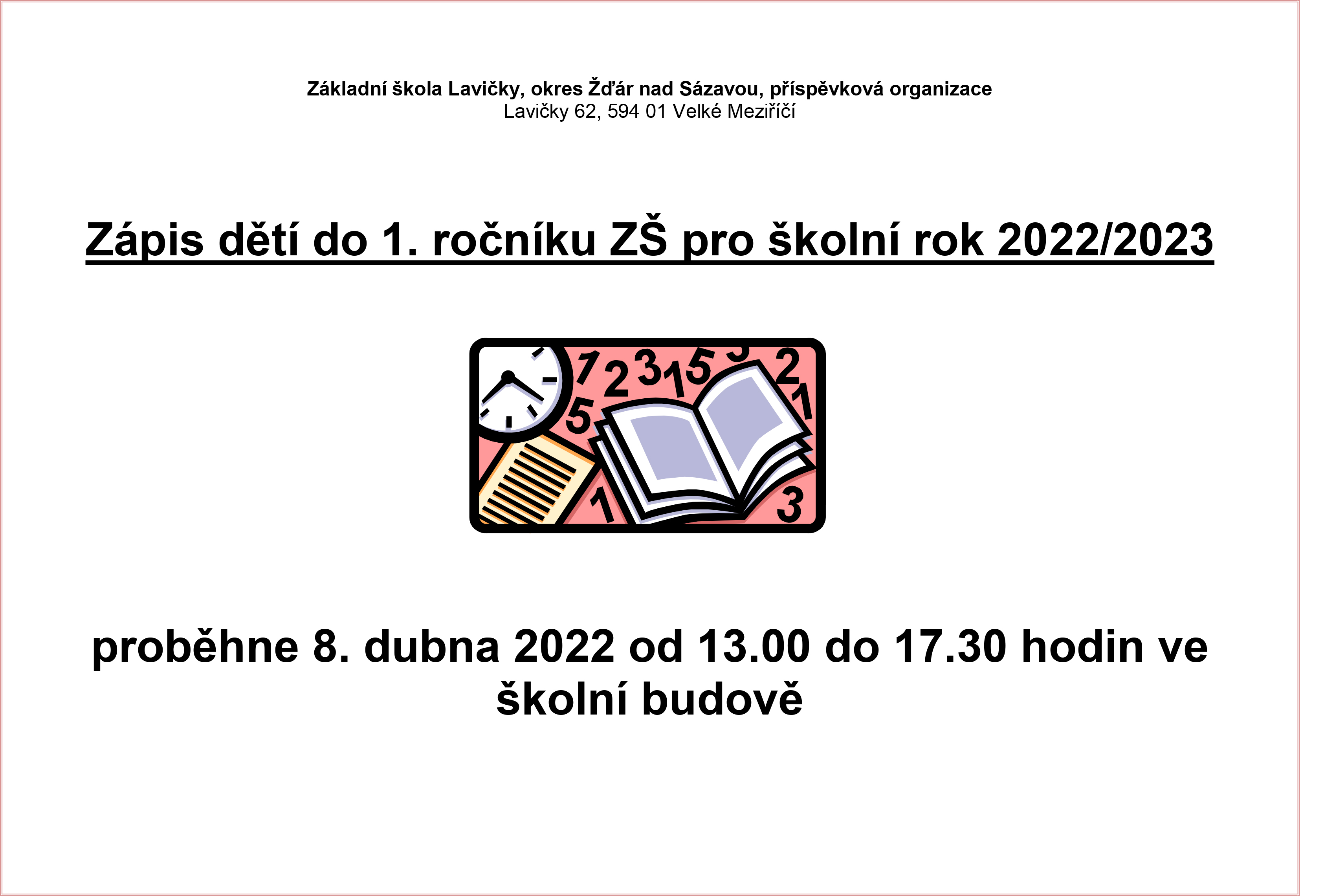 V pátek 8. dubna proběhne na Základní škole Lavičky zápis dětí do prvních tříd na rok 2022/2023. Začátek akce připadá na 13:00 hodin, končit bude okolo 17:30 hodin.