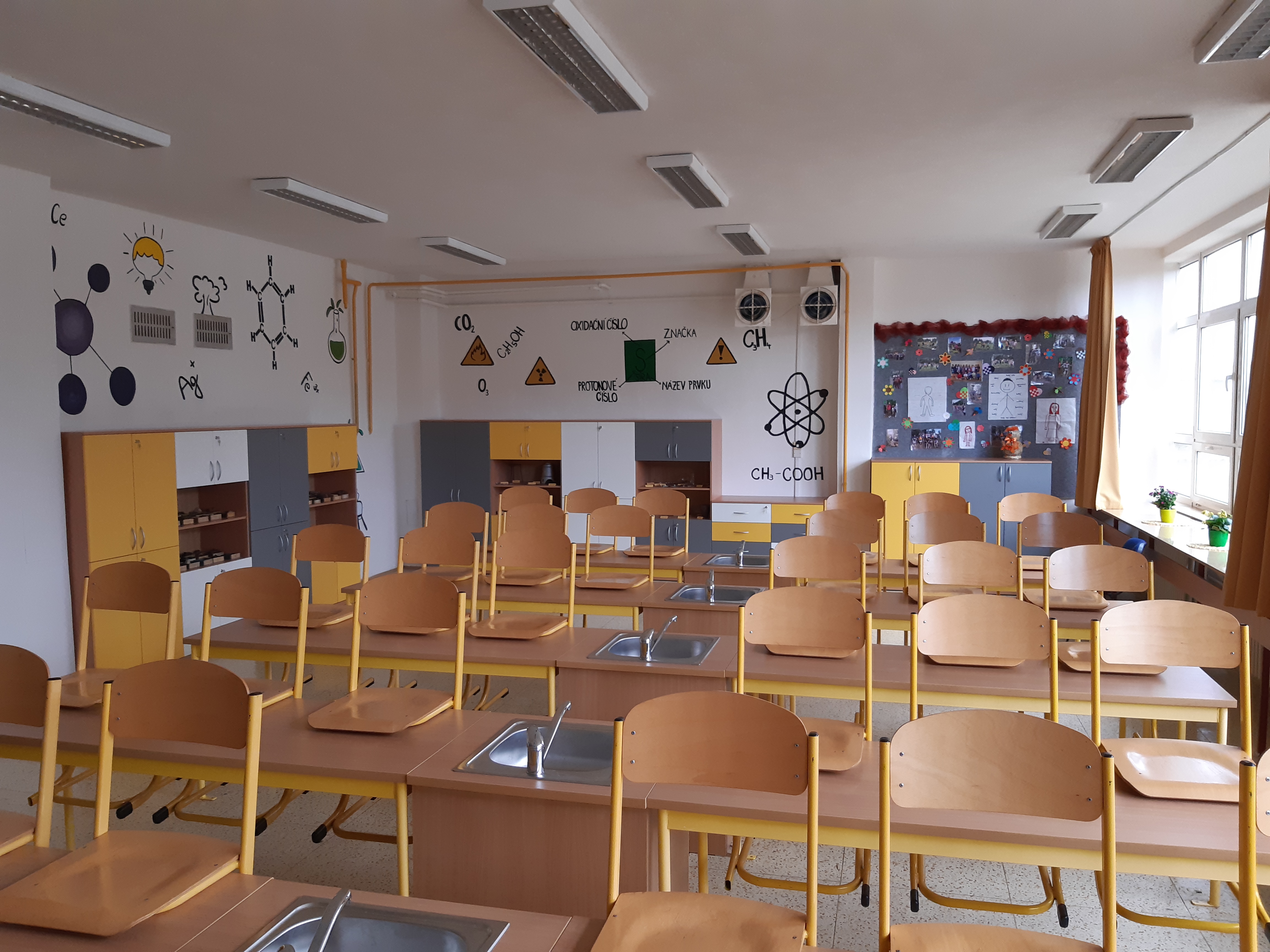 Učebna chemie slouží k odborné výuce a jako kmenová třída, proto bylo prioritou provést konečný facelift učebny tak, aby se žákům ve třídě líbilo, prostředí mělo motivační a moderní charakter a v neposlední řadě se posílila i bezpečnost. Původní nábytek v jednobarevném dřevodekoru s prosklenými vitrínami byl nahrazen nižším a stabilnějším nábytkem s korpusy v dřevodekoru a s barevnými dvířky. Vzhledem ke stávajícímu vybavení třídy byla na dvířka zvolena žlutá barva v útlumu bílé a šedé. V rámci bezpečnosti došlo k odstranění skleněných výplní vitrín.