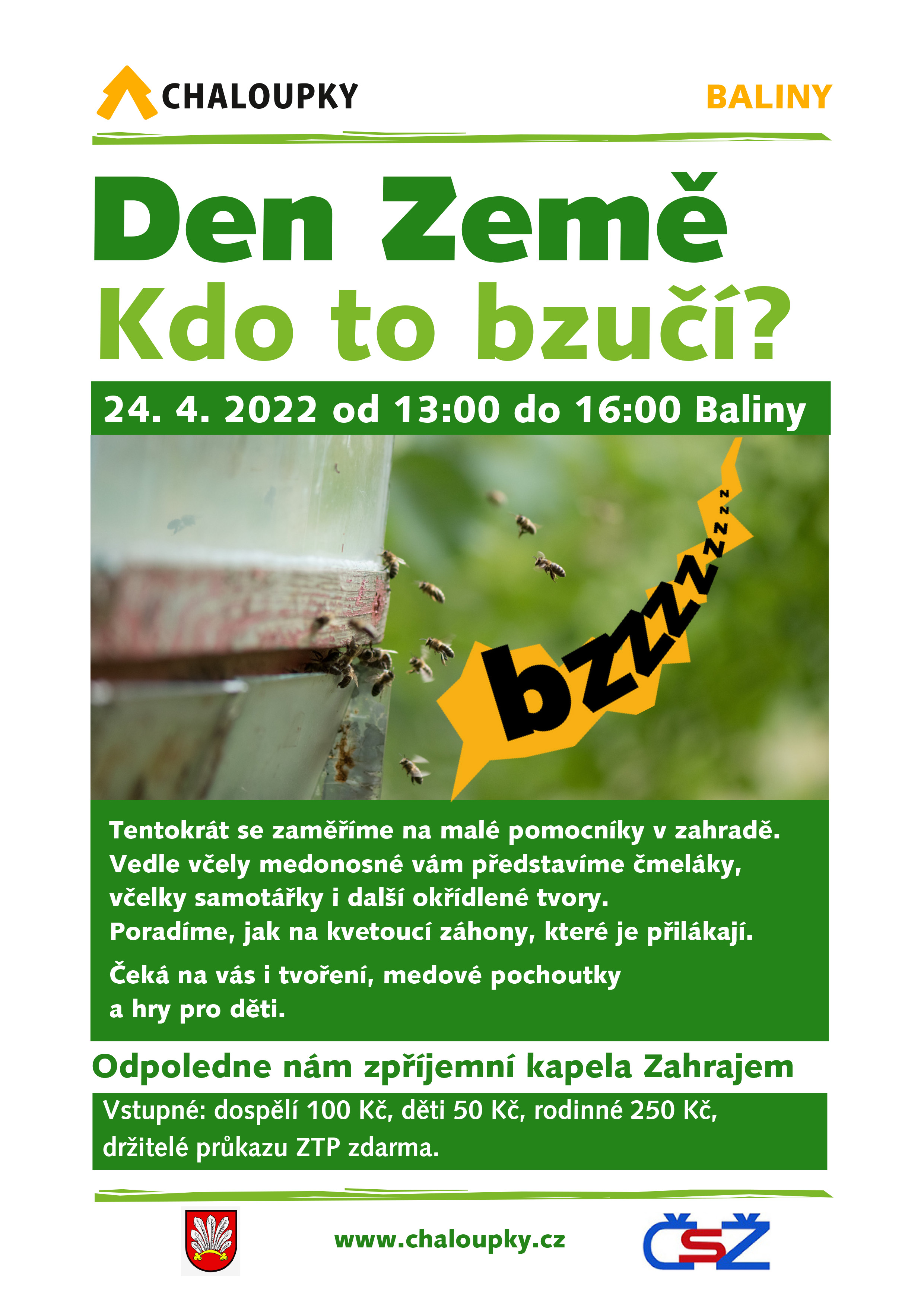 Ekocentrum Chaloupky v Balinách u Velkého Meziříčí pro vás 24. dubna od 13 hodin připravilo u příležitosti Dne Země tradiční jarní odpoledne plné pohody, zábavy i dobrých nápadů na zahradu. Zaměříme se na malé pomocníky v zahradě – čmeláky, včelky a motýly. Se včelařem si prohlédnete včely v proskleném úle, vyzkoušíte si, jak včely vidí i létají. Zblízka uvidíte i naše nové obyvatele zahrady – čmeláky, pro které jsme nachystali čmelín a ubytujeme je tam. Ochutnáte různé druhy medů a čeká Vás i medový trdelník. Pro děti jsou nachystány tvořivé dílničky, hrací koutek a pátrací hra po zahradě. Dáme Vám tipy jak na motýly a čmeláky v zahradě. K posezení u naší medové kavárničky Vám bude hrát skupina Zahrajem.