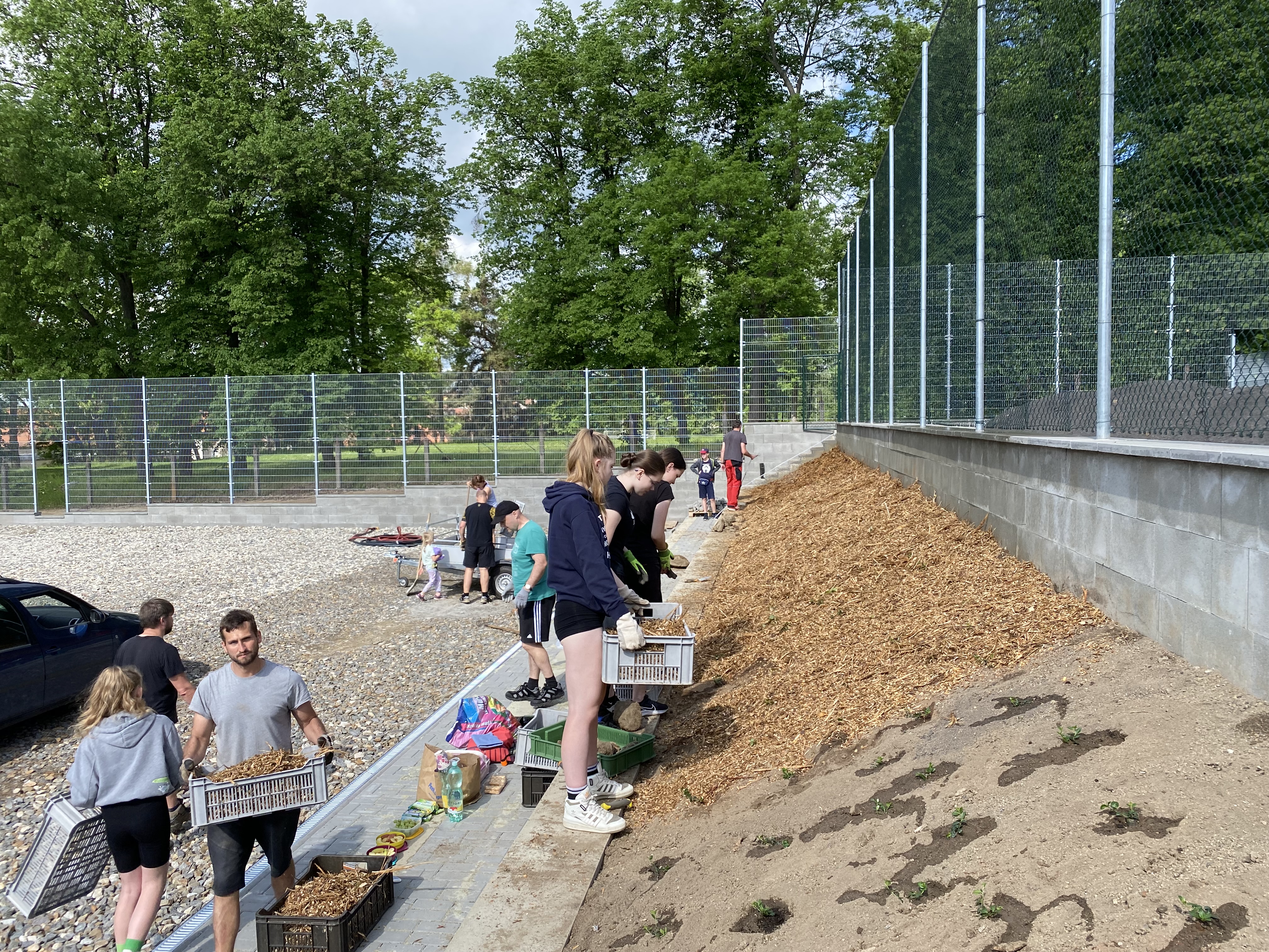 Na Areálu zdraví v sobotu 21. května sázeli tenisté místo podání modravý barvínek. Netradiční brigádu podpořili se svými rodinnými týmy. Několik set sazenic nenáročné půdopokryvné rostliny nejen zpevnilo svah a zkrášlilo prostor u spodních tenisových kurtů, ale vytvořilo i bezúdržbový záhon v rámci probíhající rekonstrukce sportoviště.