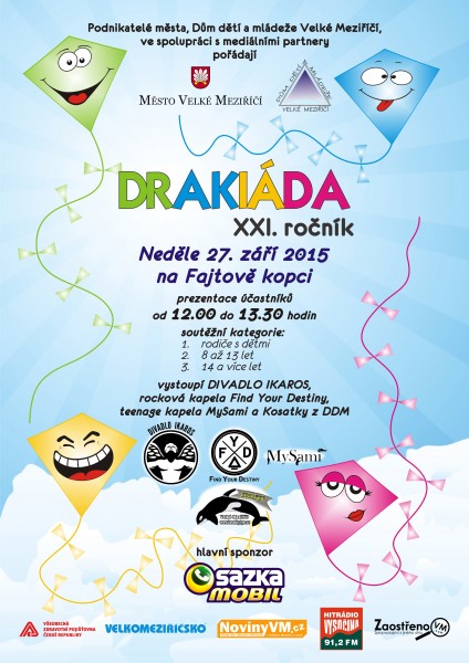 Dvacátý první ročník Drakiády startuje na Fajtově kopci v neděli 27. září. Účastníci se mohou zapsat do soutěže od 12 do 13.30 hodin.