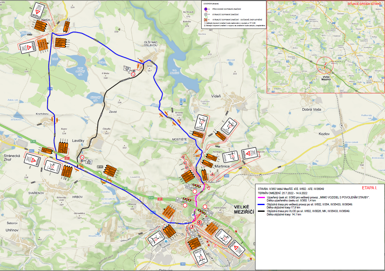 Rekonstrukce vozovky od křižovatky U Zlatého křížku započala. První stavební úpravy se týkají propustku právě u zmíněné křižovatky. Řidiči se musí obrnit trpělivostí, zhotovitel plánuje úplnou uzavírku od 25. července do 14. září 2022. Od 1. září budou stavbou smět projíždět autobusy. Objízdná trasa povede přes Mostiště, Olší nad Oslavou, Netín a kolem Kochánova zpět do Velkého Meziříčí. Pro autobusovou dopravu se trasa zkrátí z Olší nad Oslavou přes Závist a Lavičky.