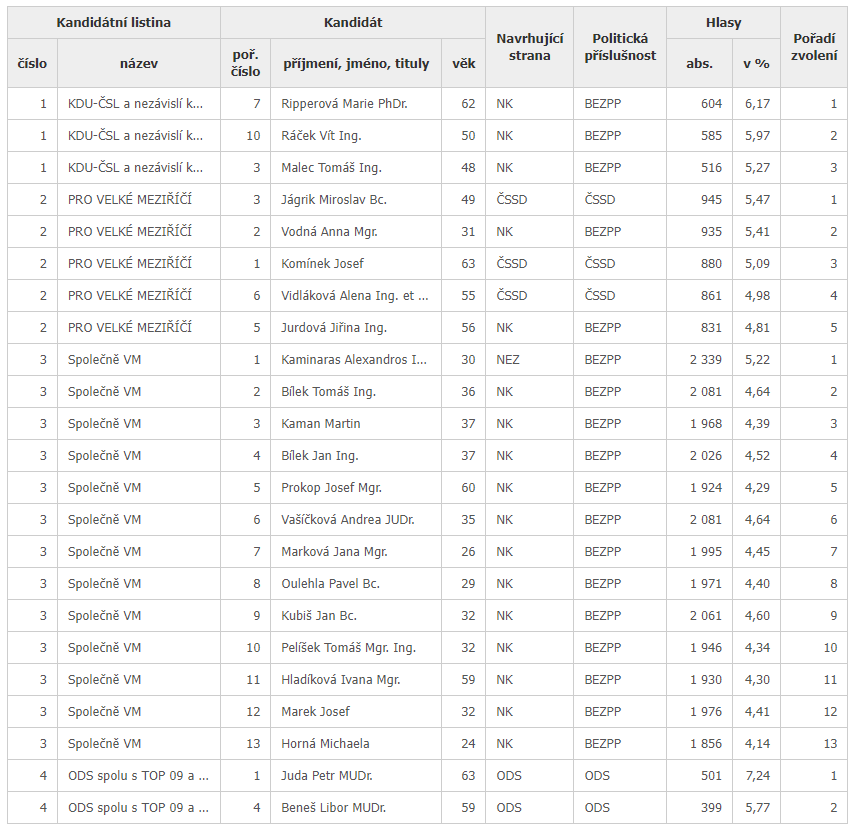 Uskupení Společně VM, v jehož čele stojí současný starosta města Alexandros Kaminaras, zvítězilo drtivě v komunálních volbách ve Velkém Meziříčí. Na druhé příčce ze čtyř možných se umístilo PRO VELKÉ MEZIŘÍČÍ. Bronzová příčka patří politické straně KDU-ČSL a nezávislí kandidáti a poslední skončilo ODS SPOLU s TOP 09 a nezávislými.