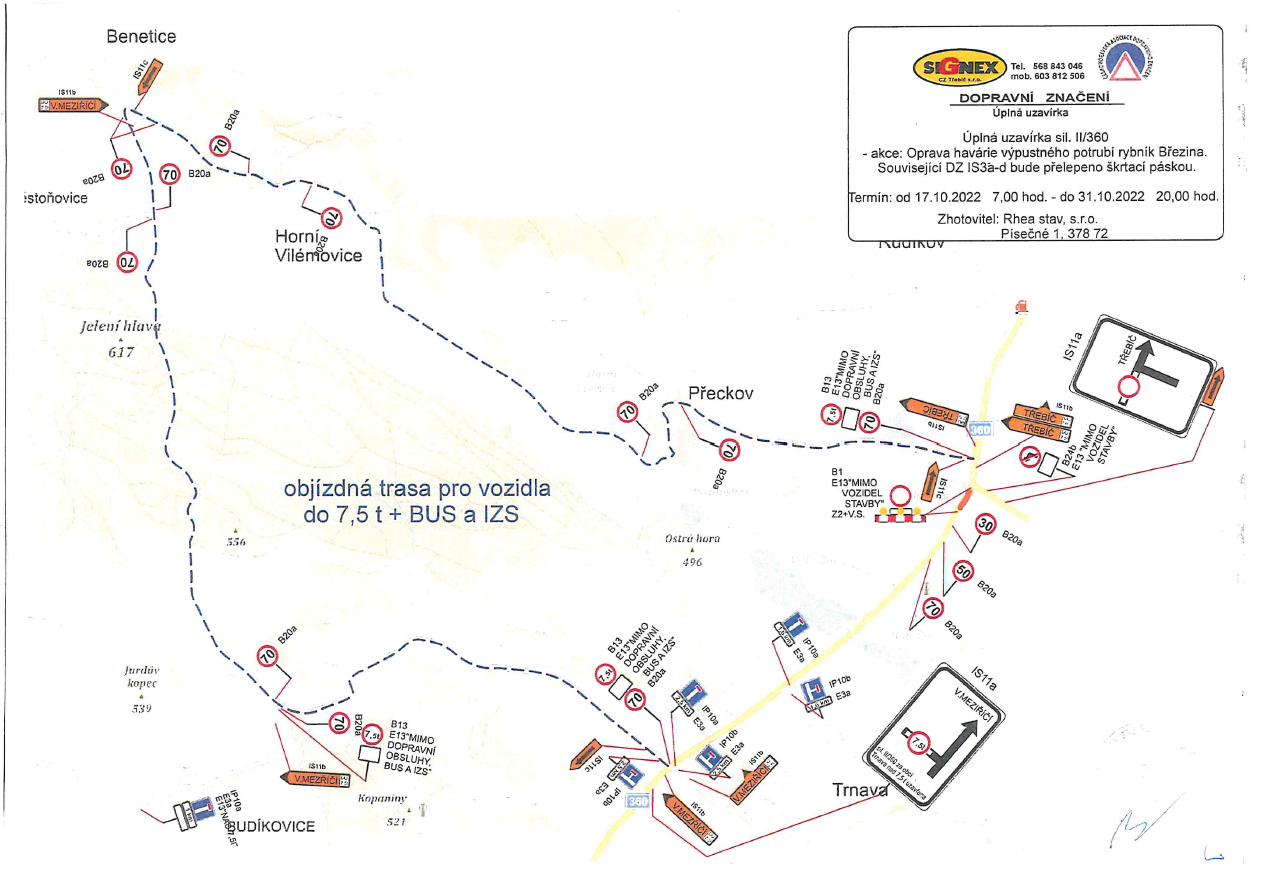 Benetice – III/36059 Horní Vilémovice – Přeckov – II/360 (obousměrně). Délka objízdné trasy 14 km.