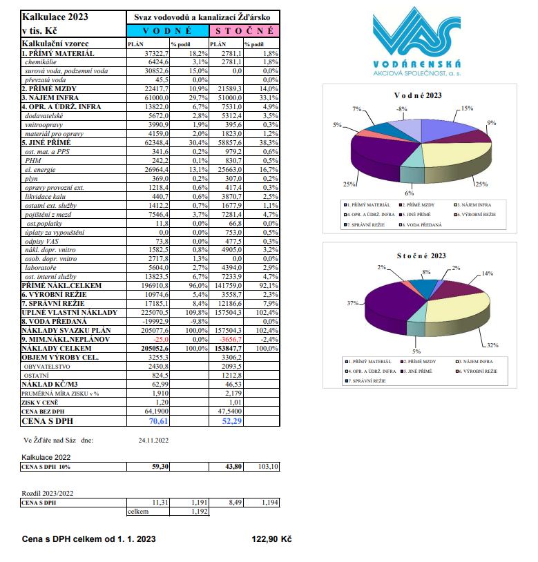 Předsednictvo Svazu vodovodů a kanalizací Žďársko na základě podrobné analýzy vnějších vlivů a provozních nákladů schválilo 24. 11. 2022 navýšení ceny vodného a stočného na rok 2023 o 19,2 %, a to s účinností od 1. 1. 2023.