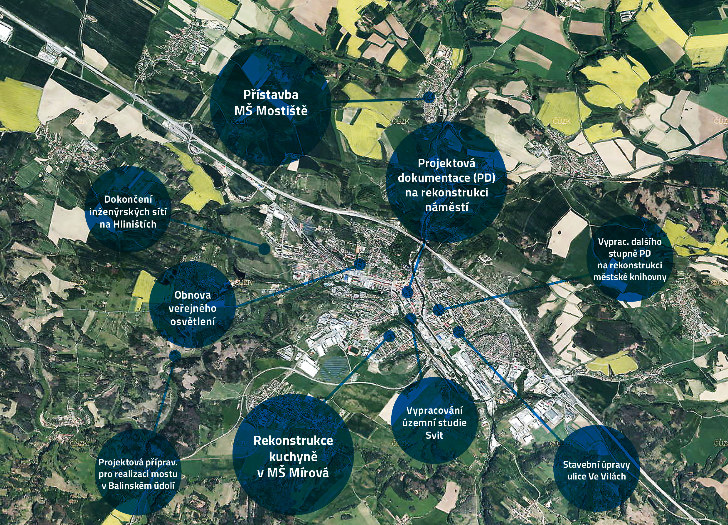 Mezi největší investiční akce v letošním roce řadíme projektovou dokumentaci na rekonstrukci náměstí, rekonstrukci kuchyně v Mateřské škole Mírová a přístavbu Mateřské školy Mostiště. Dalšími důležitými projekty jsou ty, které započaly a je třeba je dokončit. To by se mělo podařit u síťování pozemků na Hliništích, u rozsáhlé rekonstrukce ulice Ve Vilách nebo dostavby nového rybníku pod Hrbovem. Ve městě probíhá postupná obnova veřejného osvětlení, která se v příštích měsících dotkne ulic Františky Stránecké a U Světlé.
