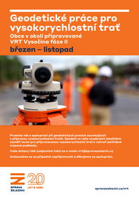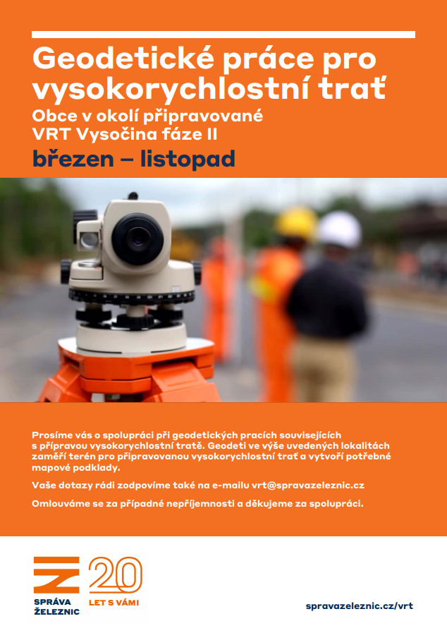 Příprava stavby vysokorychlostní železnice se posouvá vpřed. Našeho území se zatím dotknou pouze geodetické práce. Potkat zeměměřiče můžete v dotčené oblasti, zejména v okolí Velkého Meziříčí, obcí Lhotky a Dolní Radslavice, od března do listopadu letošního roku. Mapové podklady poslouží pro správný návrh stavby. O jaké území se konkrétně jedná, která geodetická společnost bude zaměření provádět, kontakty a více informací, se dozvíte v materiálech přiložených pod textem.