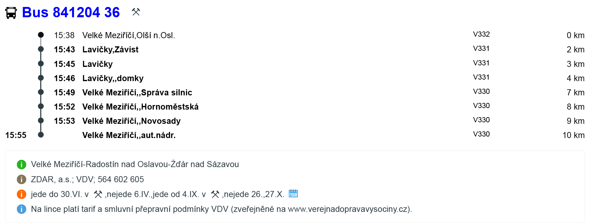 Autobusový spoj číslo 37 se v Olší mění na spoj číslo 36 a jede zpět do Meziříčí přes Závist a Lavičky.