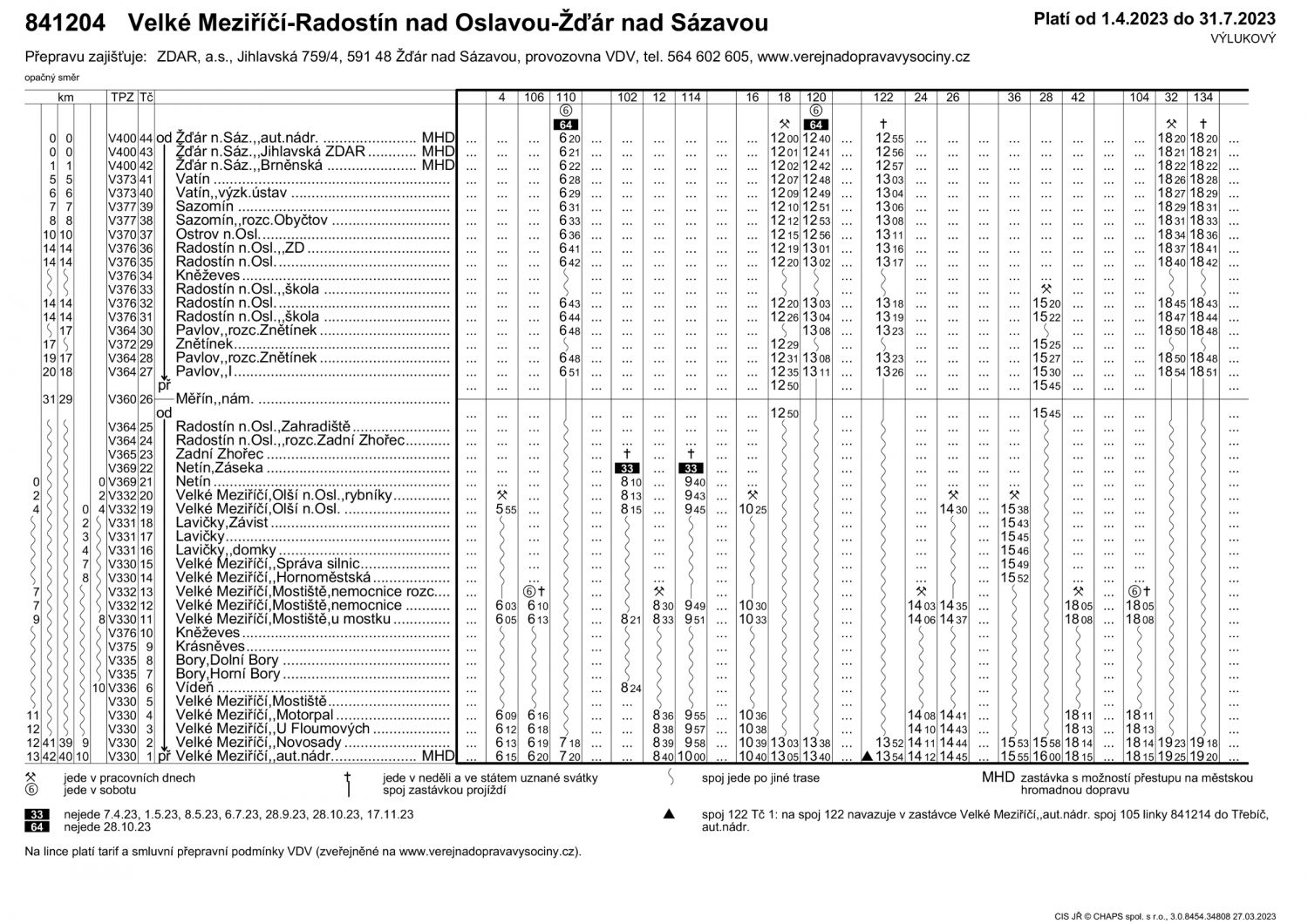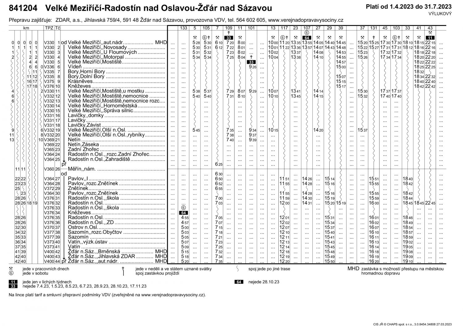 Zastávka Velké Meziříčí, Olší n. Osl., rybníky bude obsluhována spoji 841204/101,102,109,114, a to pouze do začátku uzavírky silnice III/35433.