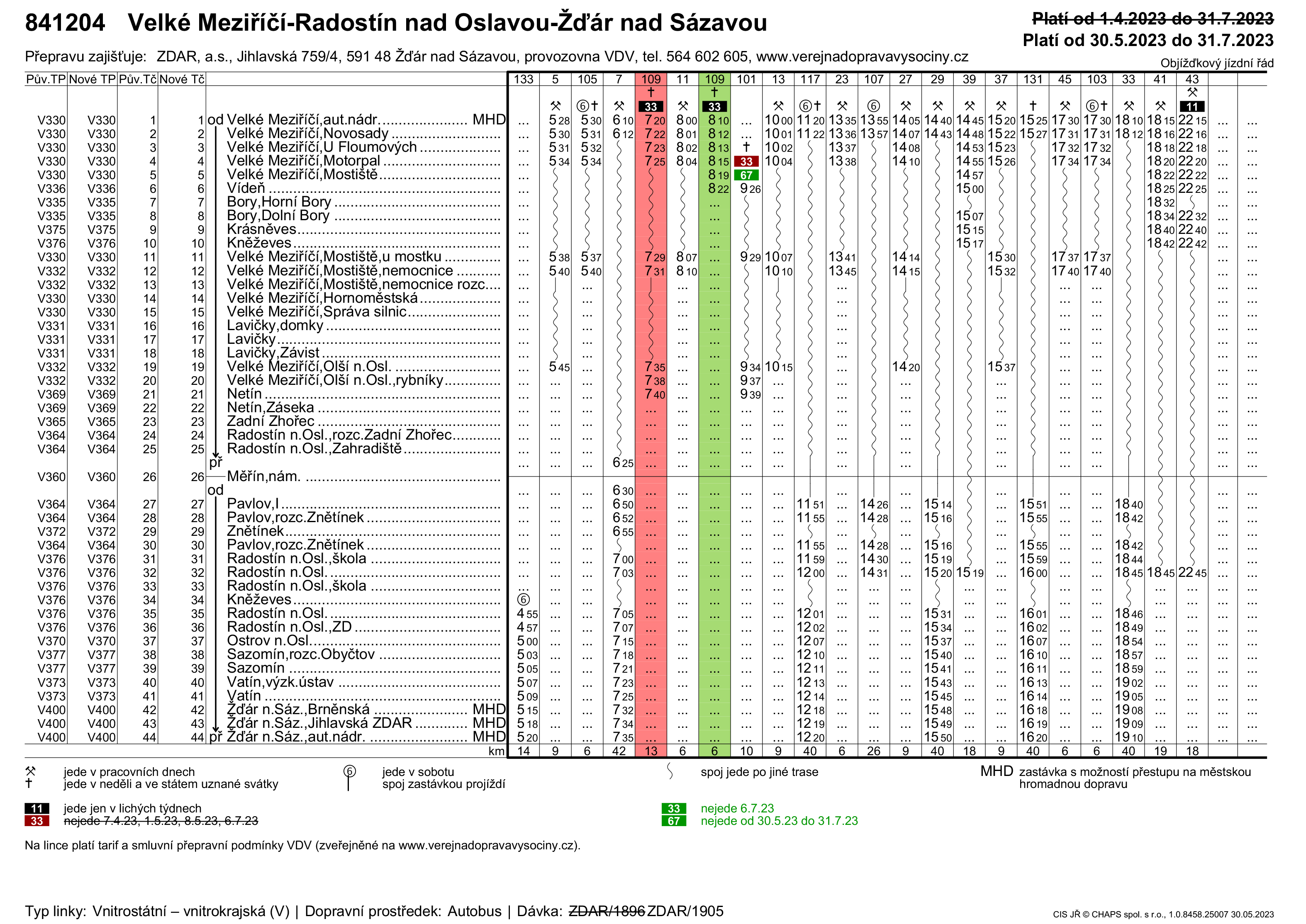 Jediná změna platí již této neděle 4. 6. Budou zrušeny nedělní spoje 841204/101 a 102 jedoucí v úseku Netín-Vídeň a nedělní spoje 841204/109 a 114 pojedou pouze v úseku Velké Meziříčí – Vídeň (viz přiložené porovnání výlukových jízdních řádů). Výlukový jízdní řád je sice schválen až do 31. 7. (předpokládaný konec I. etapy uzavírky silnice II/354, ale dopravní řešení autobusové dopravy od 1. července bude záviset na tom jestli budou realizovány další plánované uzavírky. Vzhledem k souběhu uzavírek se bohužel jízdní řády s vysokou pravděpodobností budou v průběhu léta částečně měnit každý měsíc.