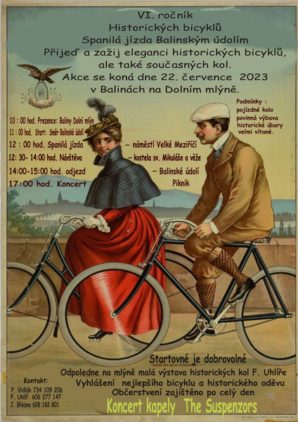 Spanilá jízda historických bicyklů vyjede z Dolního mlýna v Balinách a dorazí na velkomeziříčské náměstí 22. července.
