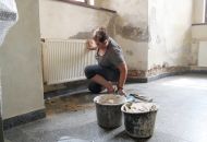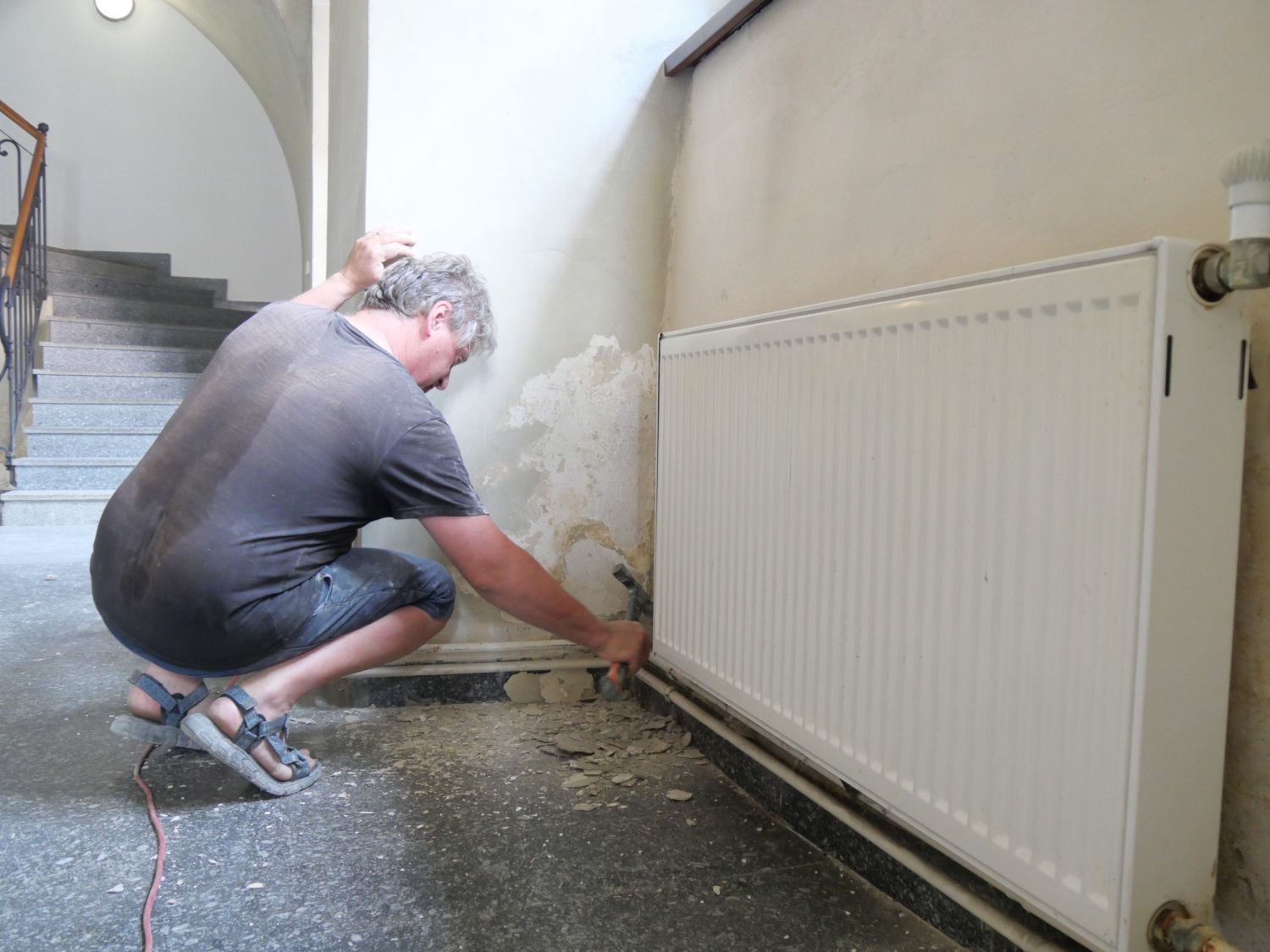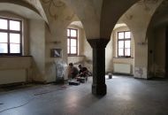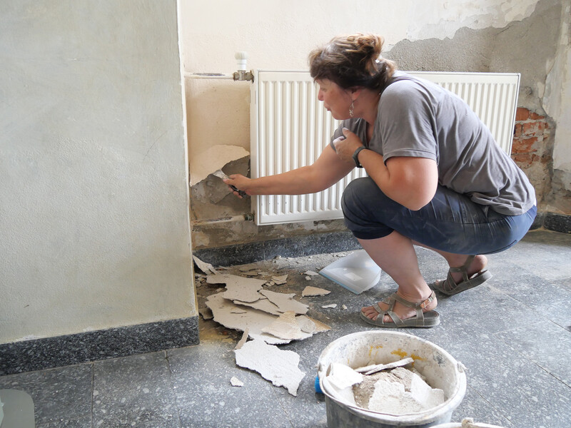 Po odstranění staré a vlhké omítky nastoupí na místo restaurátorů na čas topenáři, kteří mají za úkol trubky od topení vedené po stěně zasekat přímo do zdi. Až bude hotovo, manželé Procházkovi se pustí do natahování nové omítky. „Ve finále ji budeme barevně slaďovat s tou původní nahoře na stropě,“ uzavírá Pavel Procházka.