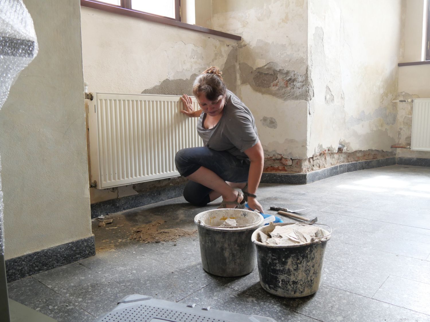 „Pustili jsme se do odstraňování špatných omítek. Jsou tu znát nánosy z devadesátých let, které nejsou sjednocené s okolím,“ popisuje restaurátor Pavel Procházka a ukazuje na místo, kde se jeho manželce Miriam pod rukama odlupují velké kusy omítky. „Neprospíval tomu ani ten uzavřený ostrůvek s recepcí, který tu donedávna byl. Zabraňoval proudění vzduchu,“ dodal.