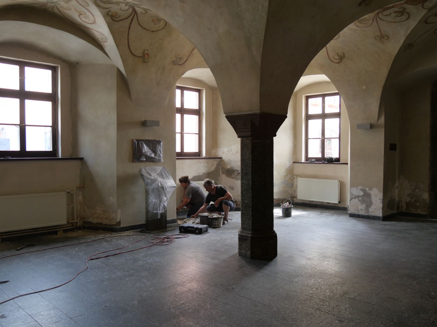 Restaurátorské práce na radnici začaly. Vstupní halu s malovanou klenbou čeká obnova omítek.