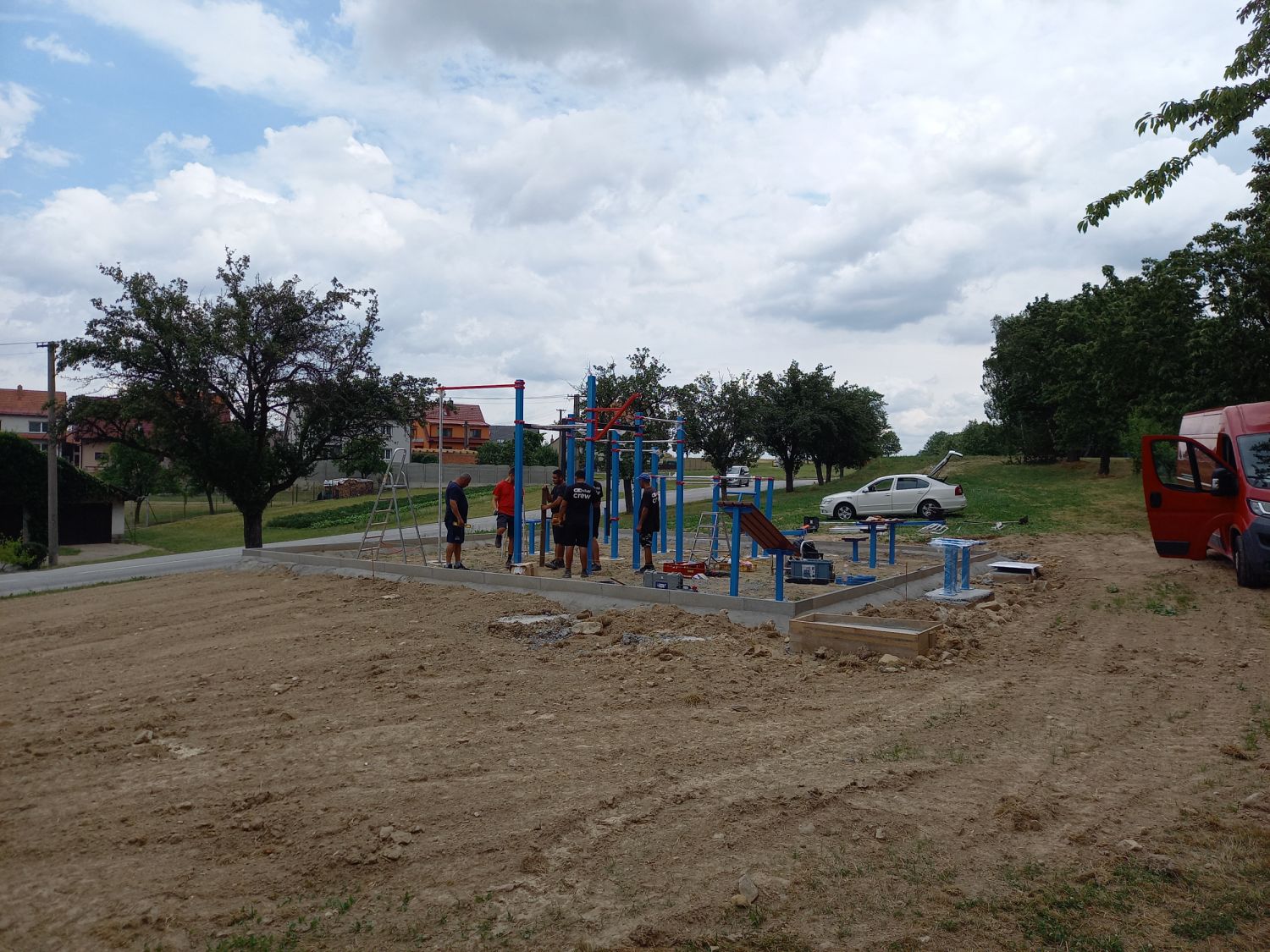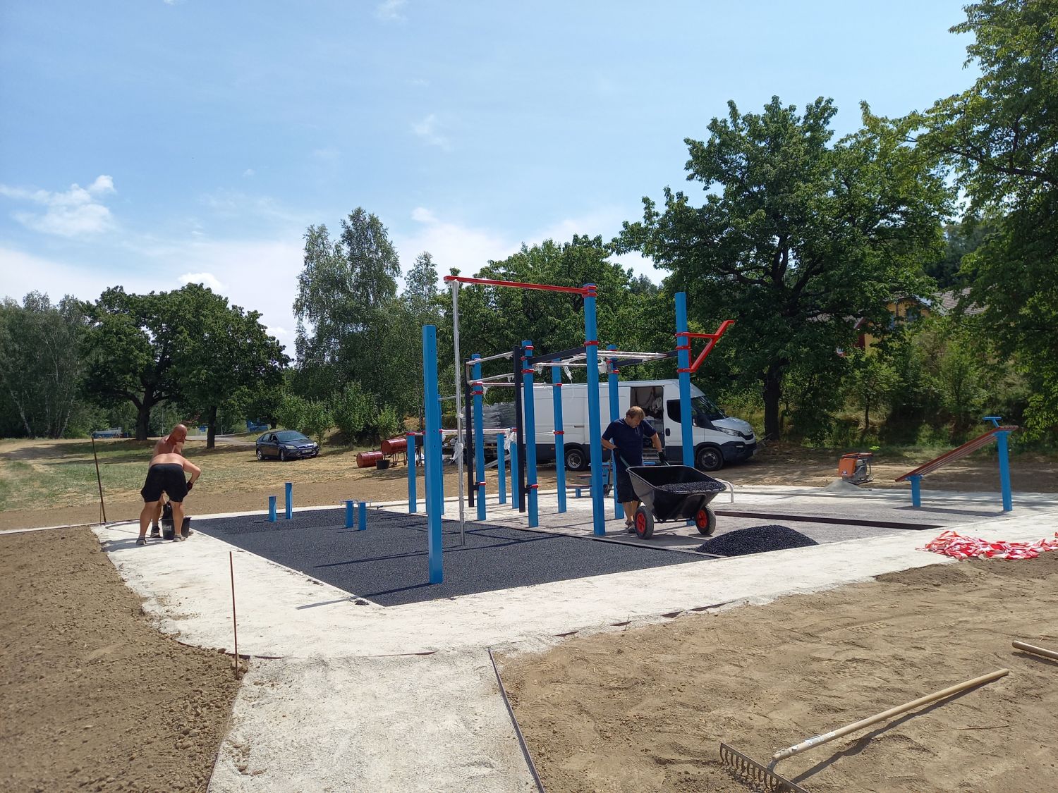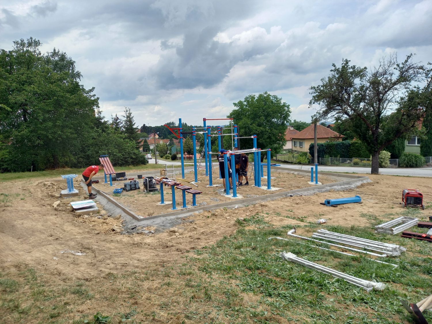 Začalo tedy budování workoutového hřiště HYBRID PLUS. Toto hřiště je variantou velmi oblíbeného hřiště HYBRID, která navíc obsahuje prvky se zvýšenou kritickou výškou pádu. Kromě základních prvků pro cvičení s vlastní váhou, jako jsou hrazdy v různých výškách a variantách, i dvojitá bradla, stalky, držáky na kruhy, monkey bar pro ručkování, svislé žebřiny, různé lavice a informační tabuli; na ní najdeme ještě držák na lano, svislou trubku pole dance, šikmý žebřík na ručkování monkey bar wing, a na ploše ještě stupínky step up a lavici se stalky. HYBRID PLUS je vhodný jako hřiště pro obce nad 2000 obyvatel, hodí se do parků, jako vybavení sportovních ploch a míst určených k aktivnímu trávení volného času. Najednou na něm může cvičit až 26 lidí.