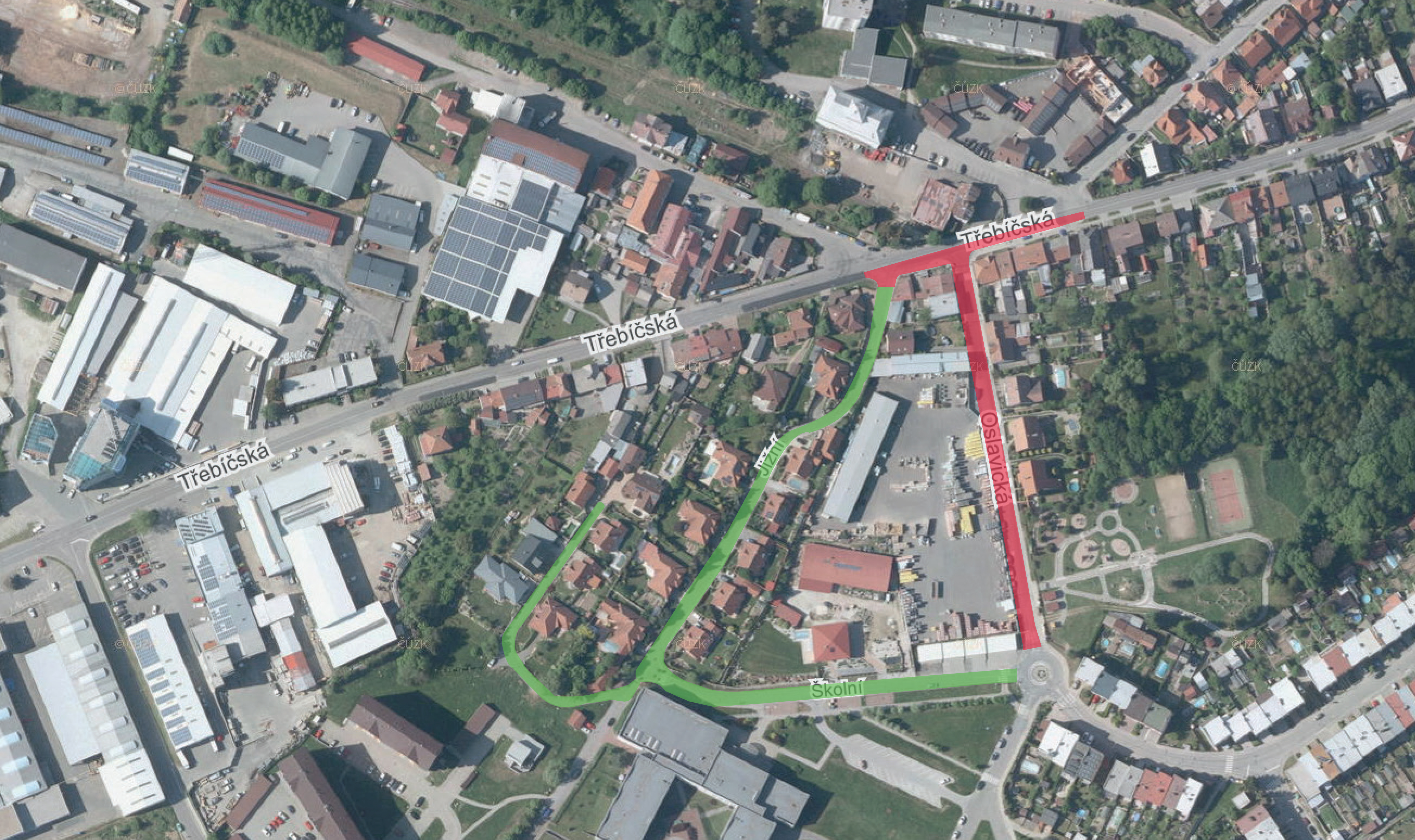Současně bude asfaltování probíhat i v křižovatce Třebíčská x Jižní (viz nákres červenou barvou), pro obyvatele Jižní ulice bude umožněn příjezd ze Školní (viz nákres zelenou barvou).