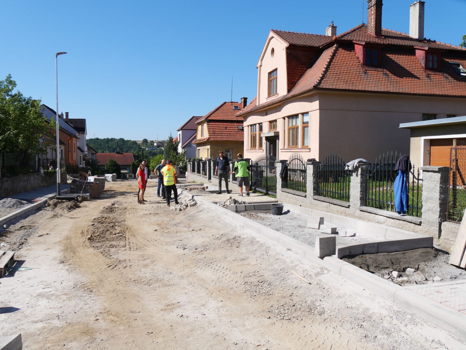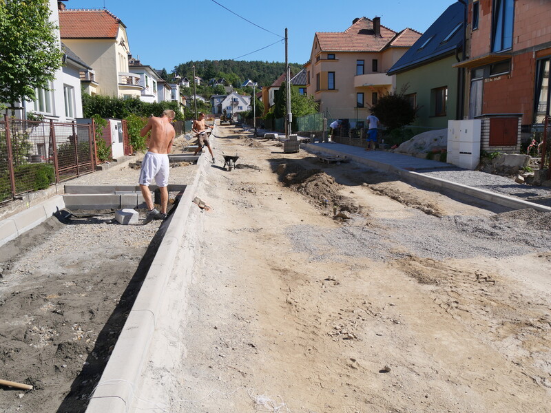 V horní části ulice Ve Vilách pokračuje stavba chodníků, parkovacích stání, osazování obrubníků, dláždění vjezdů. V půli září bude dokončeno i veřejné osvětlení ulice. Práce pokračují tak, aby začátkem října mohla být položená první asfaltová vrstva komunikace. Poté dojde k výškové úpravě šachet inženýrských sítí a po dokončení všech detailů k pokládce finálního asfaltu v ulicích Nad Sv. Josefem i Ve Vilách.