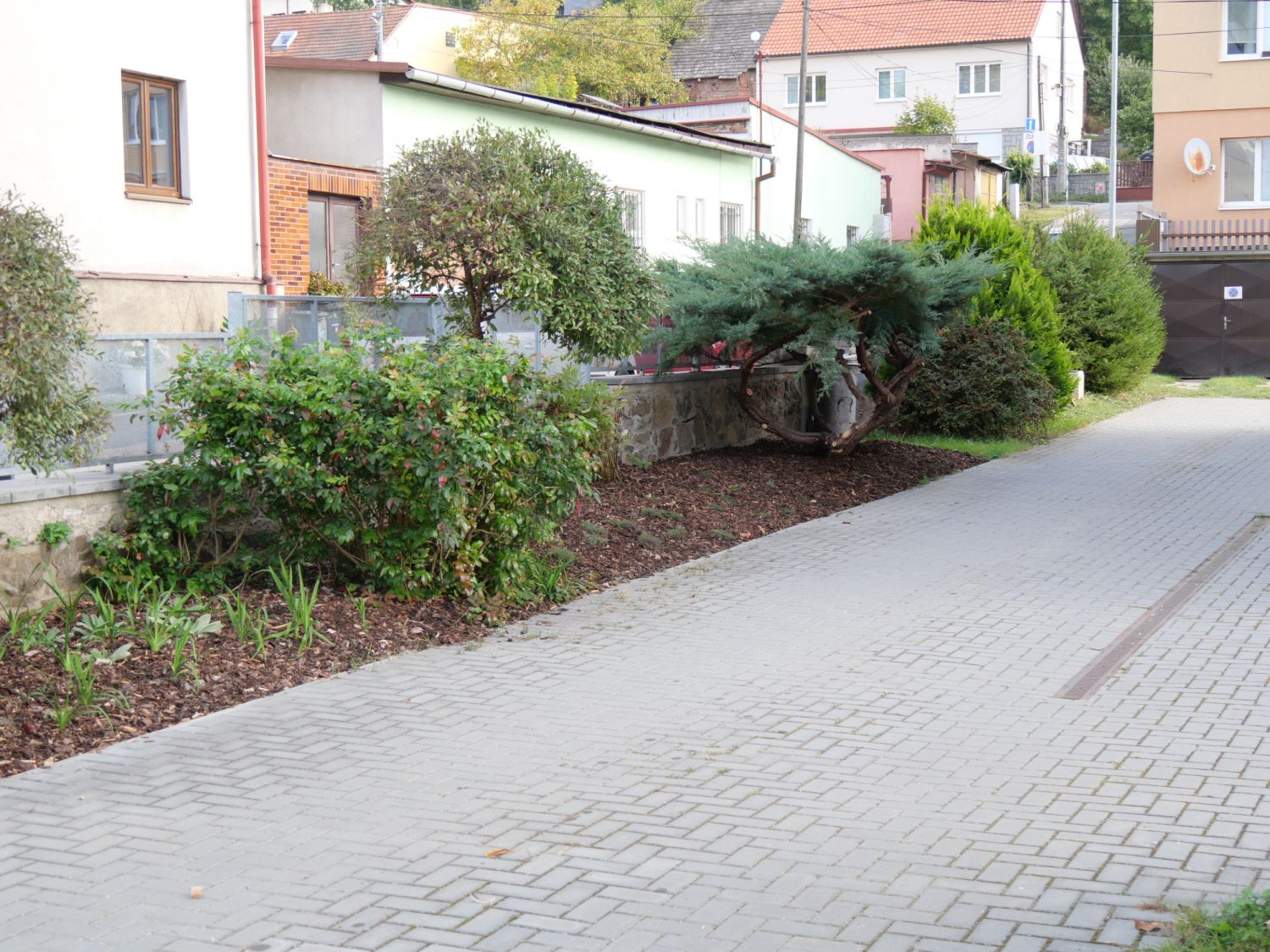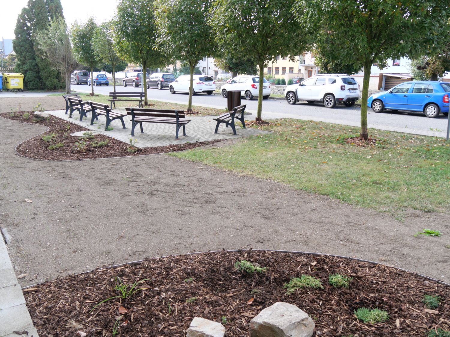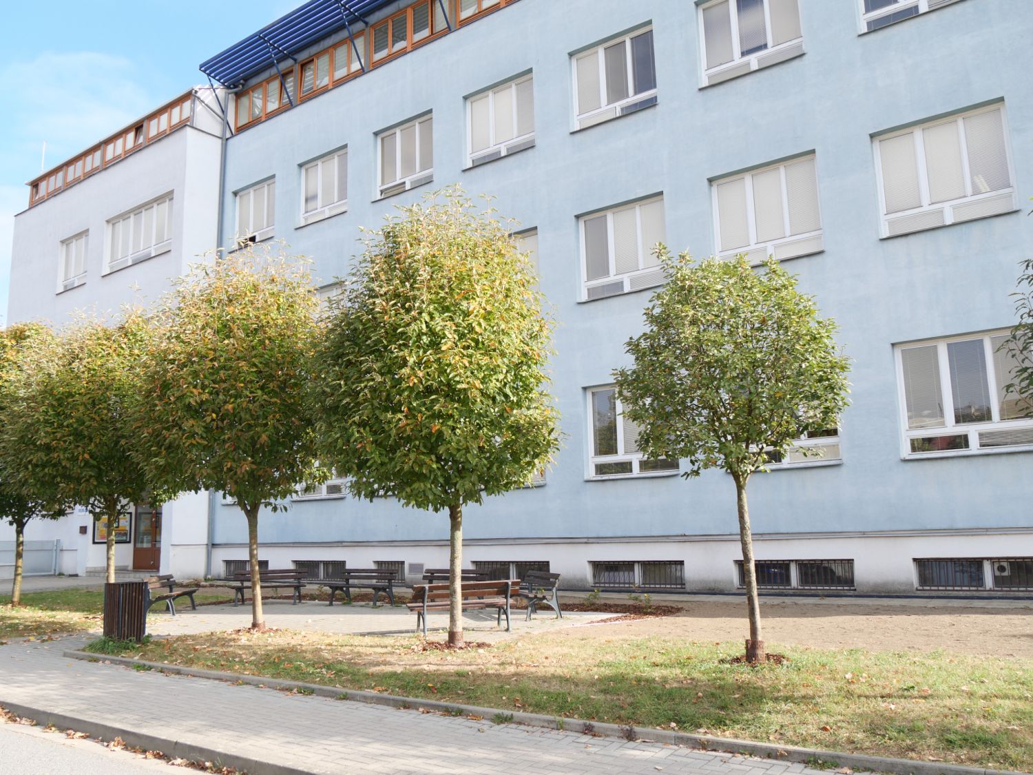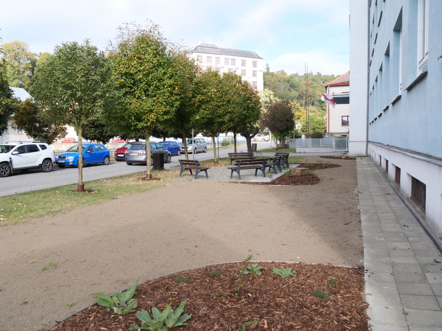 Túje byly vykáceny a jejich místo obsadily nové keře a květiny. Vytvářejí záda k posezení, které je před školou. „Nová výsadba je ve žluto-bílé kombinaci a doplňuje celou říční promenádu i stromořadí tvořené jeřábem mukem, na němž dozrávají červené bobule,“ informovala městská zahradní architektka Tereza Axmanová.